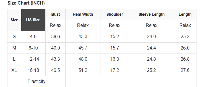 See size chart for approximate measurements.