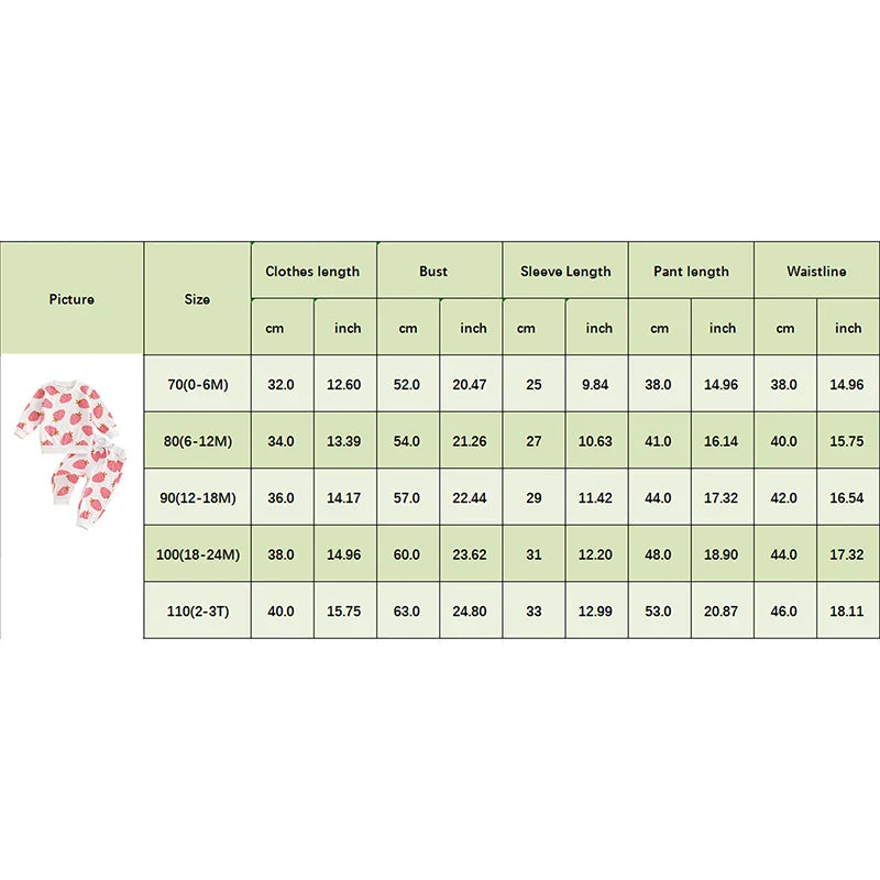 70 Tops Length: 12.6 Bust: 20.47 Sleeve: 9.84 Shoulder: 8.27 Pants Length: 14.96 Waist: 14.96 Hip: 20.47 Advised Age: 0-6 Months