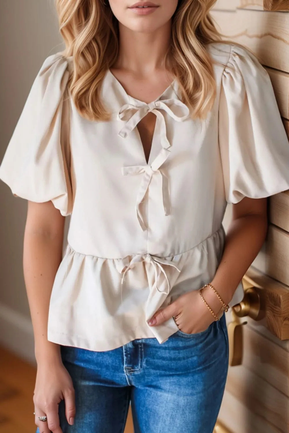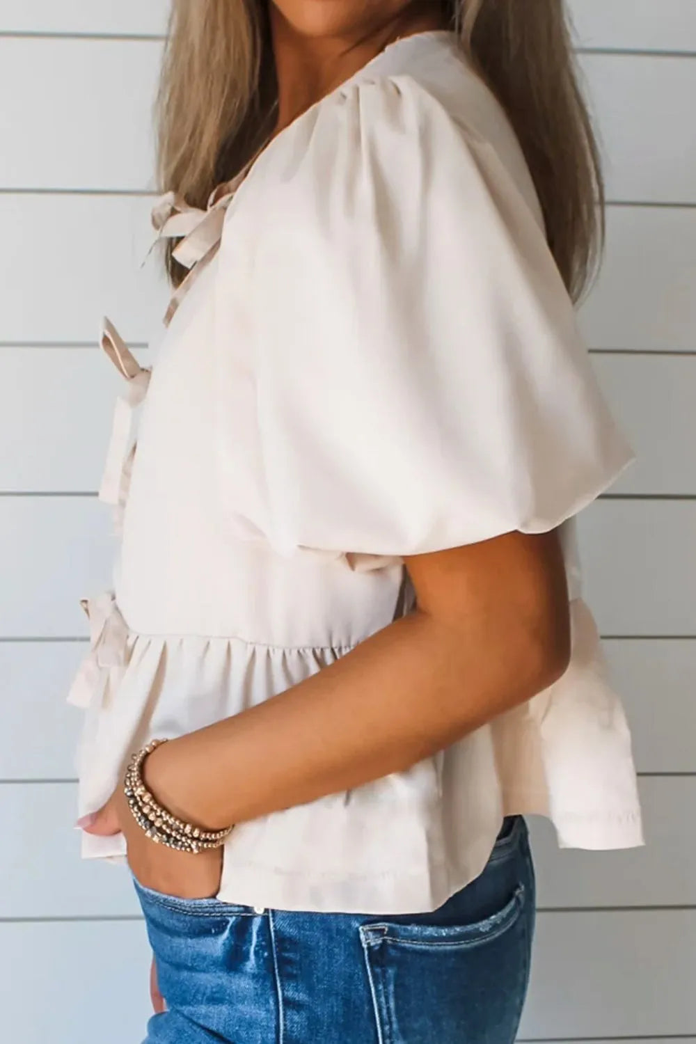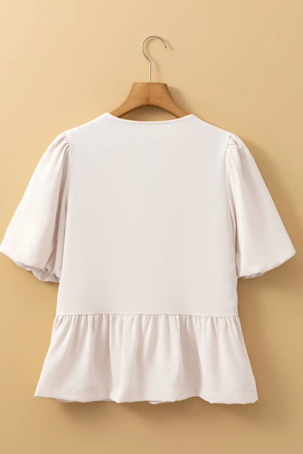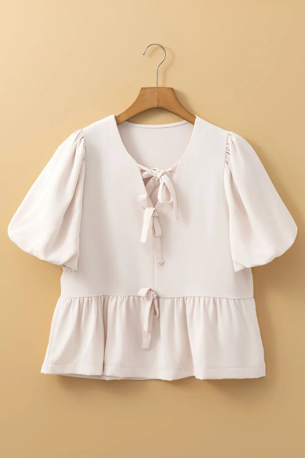 Bow Tie Short Puff Sleeve Ruffle Hem Blouse