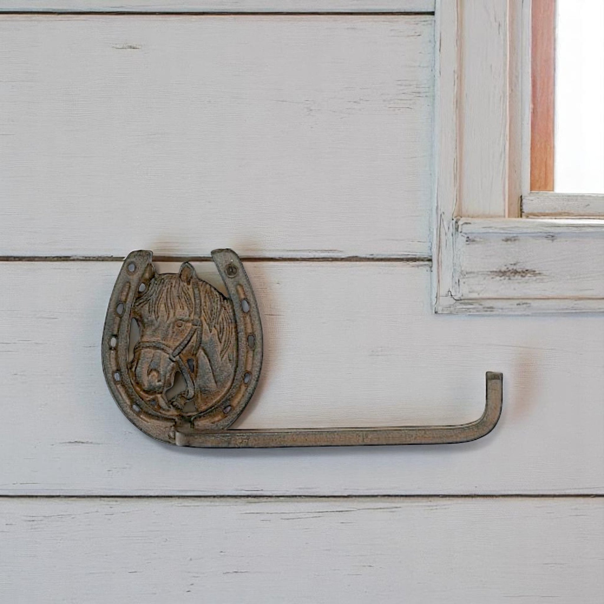 Cast Iron Horse Head and Horseshoe Tissue Holder - Rustic Western Farmhouse Bathroom Decor, Cowboy Ranch Accent