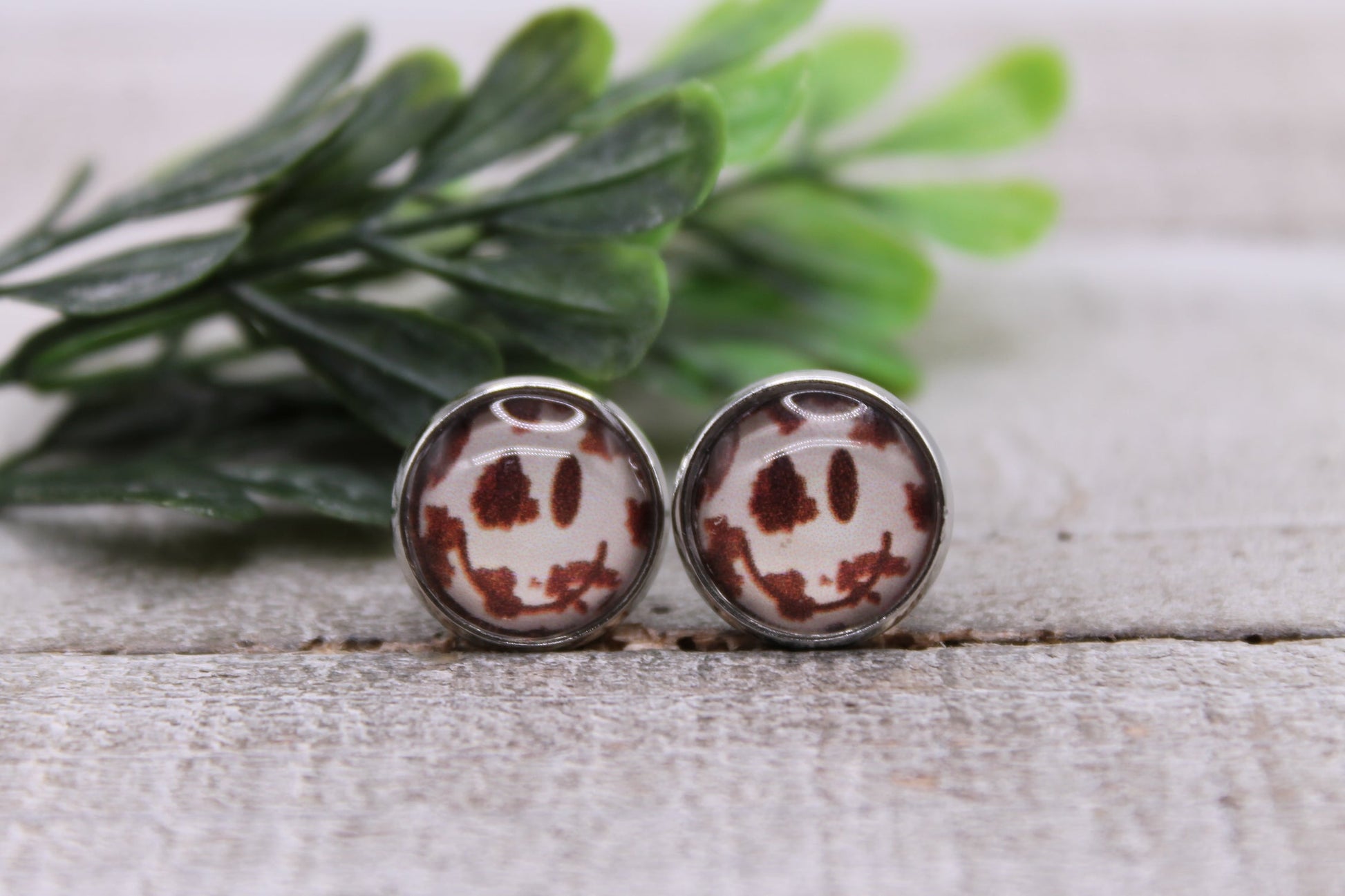 Cow Smiley Face || 12mm Glass Stud Earrings || Hypoallergenic