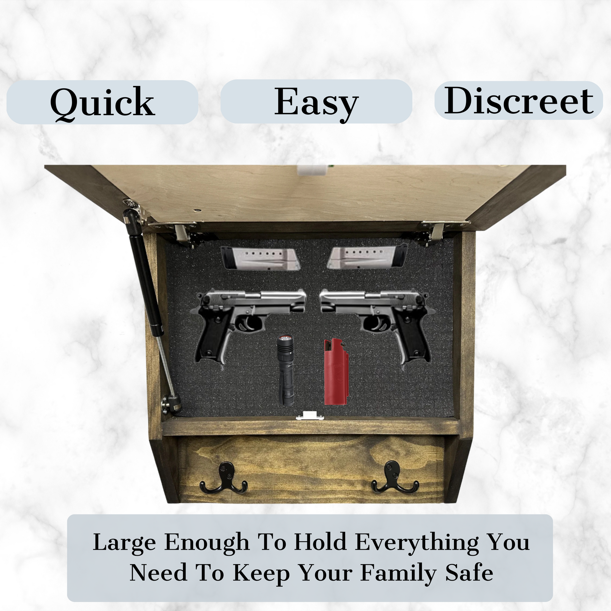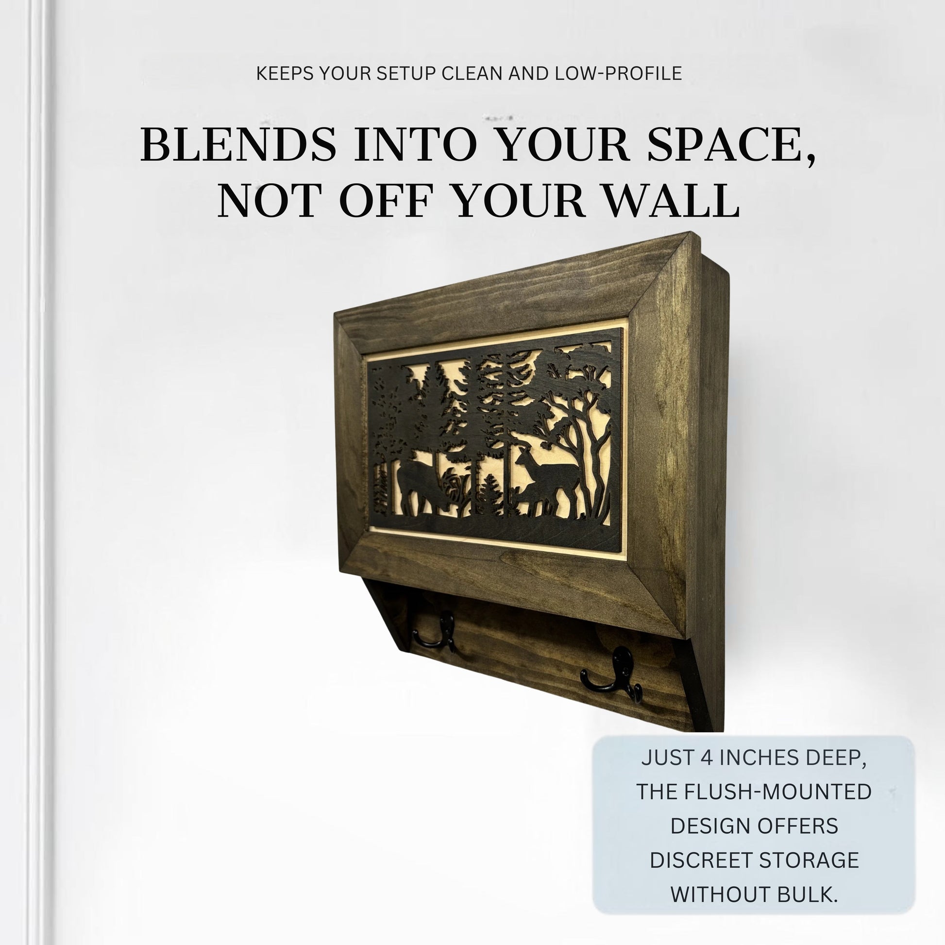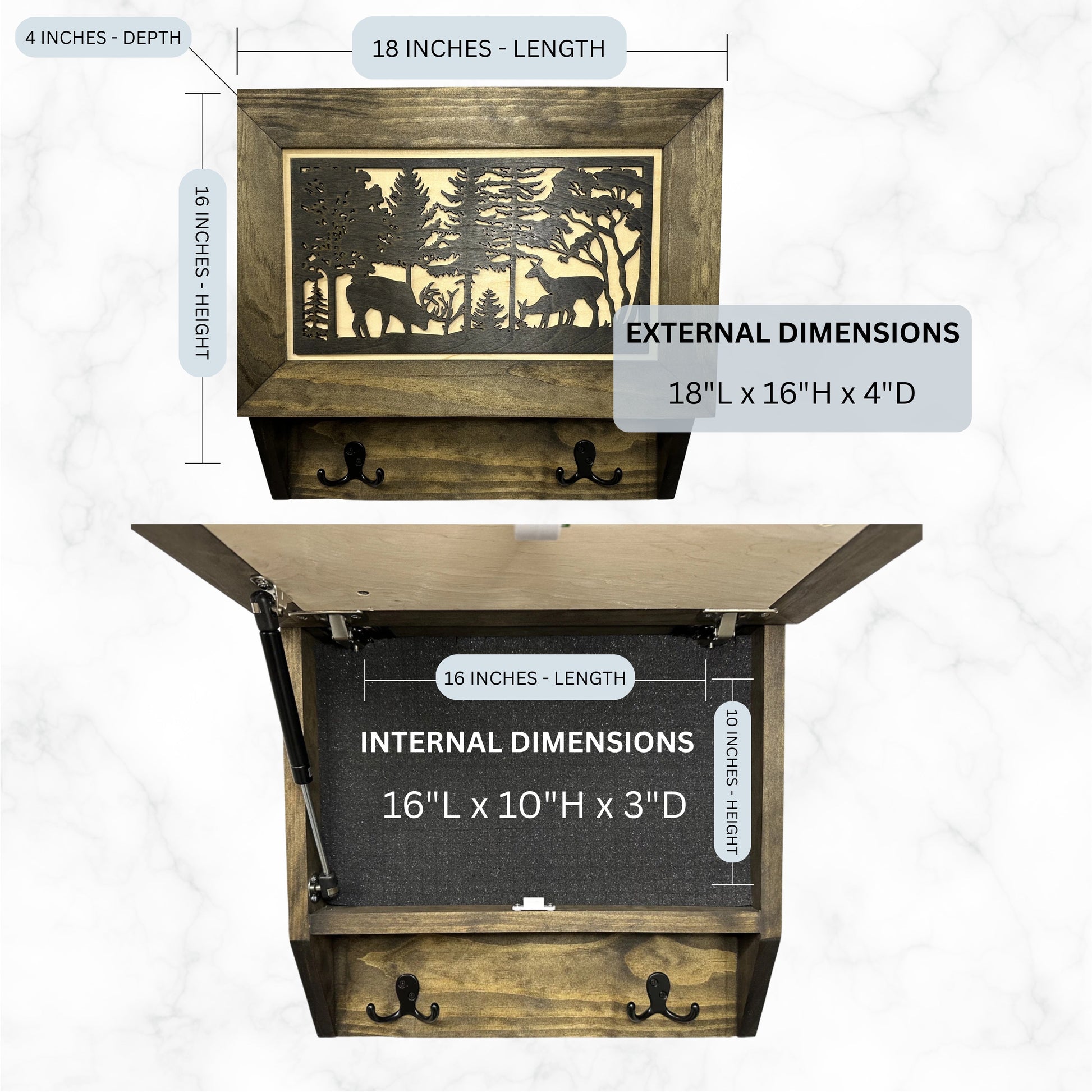Securely store your firearm in the Deer Scene Wall Mounted Gun Safe. This artistically crafted pistol cabinet showcases a serene woodland silhouette complete with deer, trees, and natural surroundings — blending function, artistic design and home security all in one! Perfect for the outdoor enthusiast, deer hunter or anyone wanting secure firearm storage that doubles as tasteful wall décor and a coat, hat and key storage hooks. With a quick access locking mechanism, your firearm remains protected yet immediately reachable when needed. This unique piece hides in plain sight, offering an unexpected level of security and charm that complements any style interior.