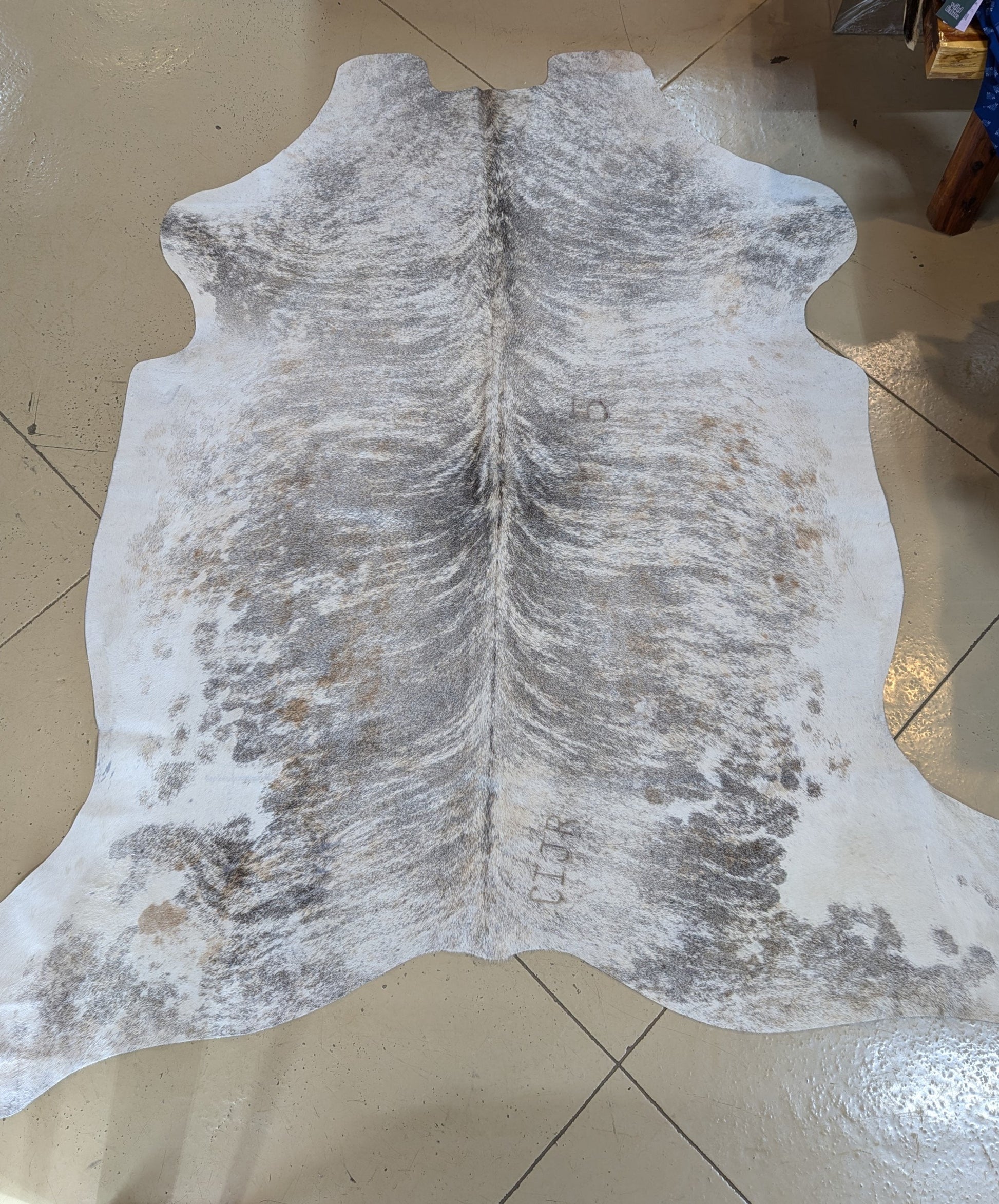 Diamond here is truly one of a kind. She has a beautiful silver brindle coloration with white edges and tan spots. She also features two brand marks and measures at 75 x 83 x 55 inches.