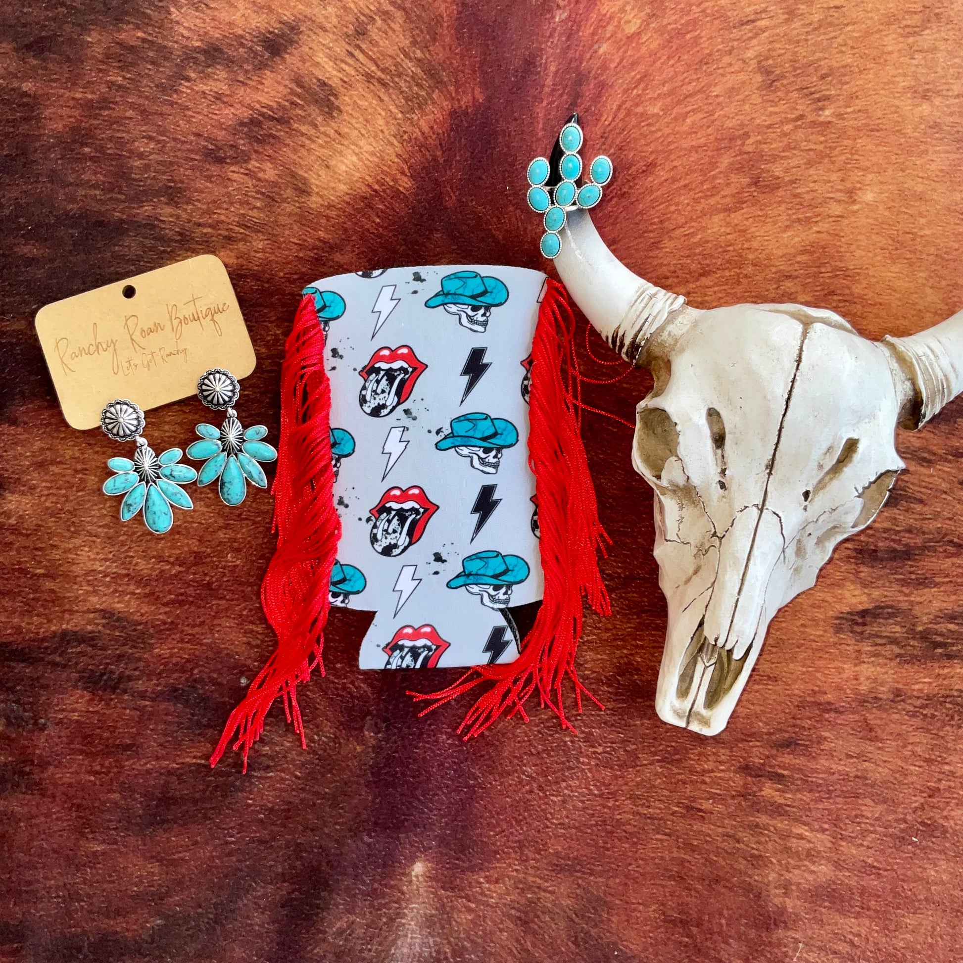 Distressed Turquoises Cowboy Skelly Fringe Slim Koozie