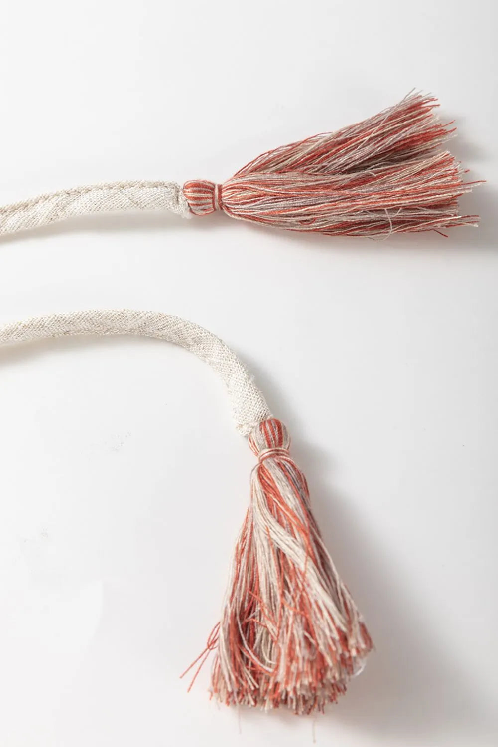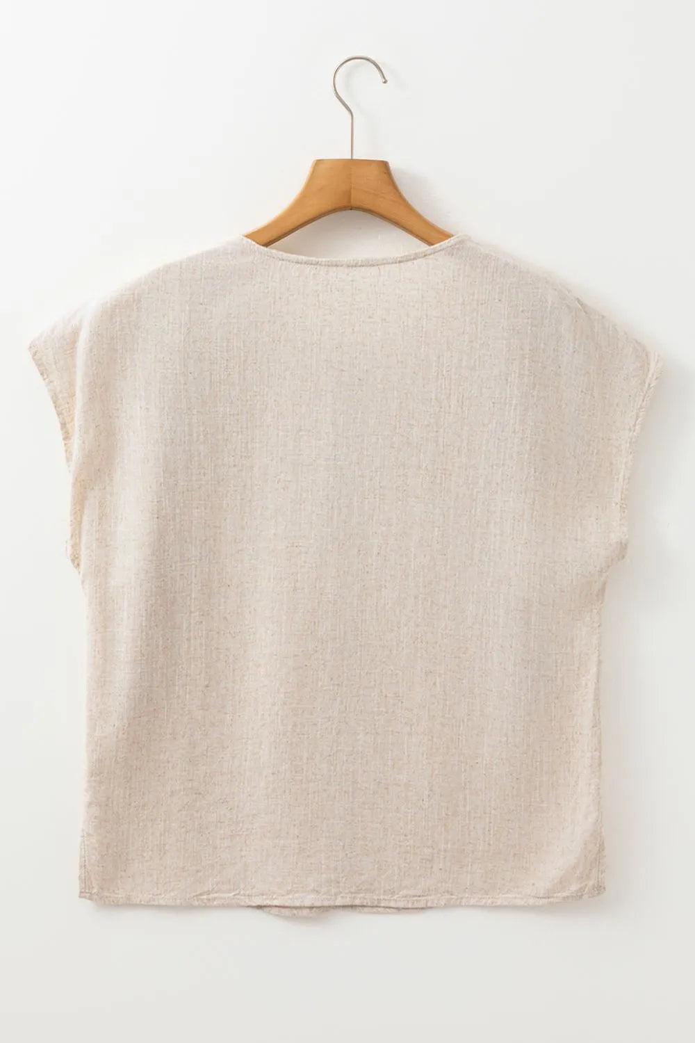 Geometric Embroidered Short Sleeve Tassel Tie Neck Blouse