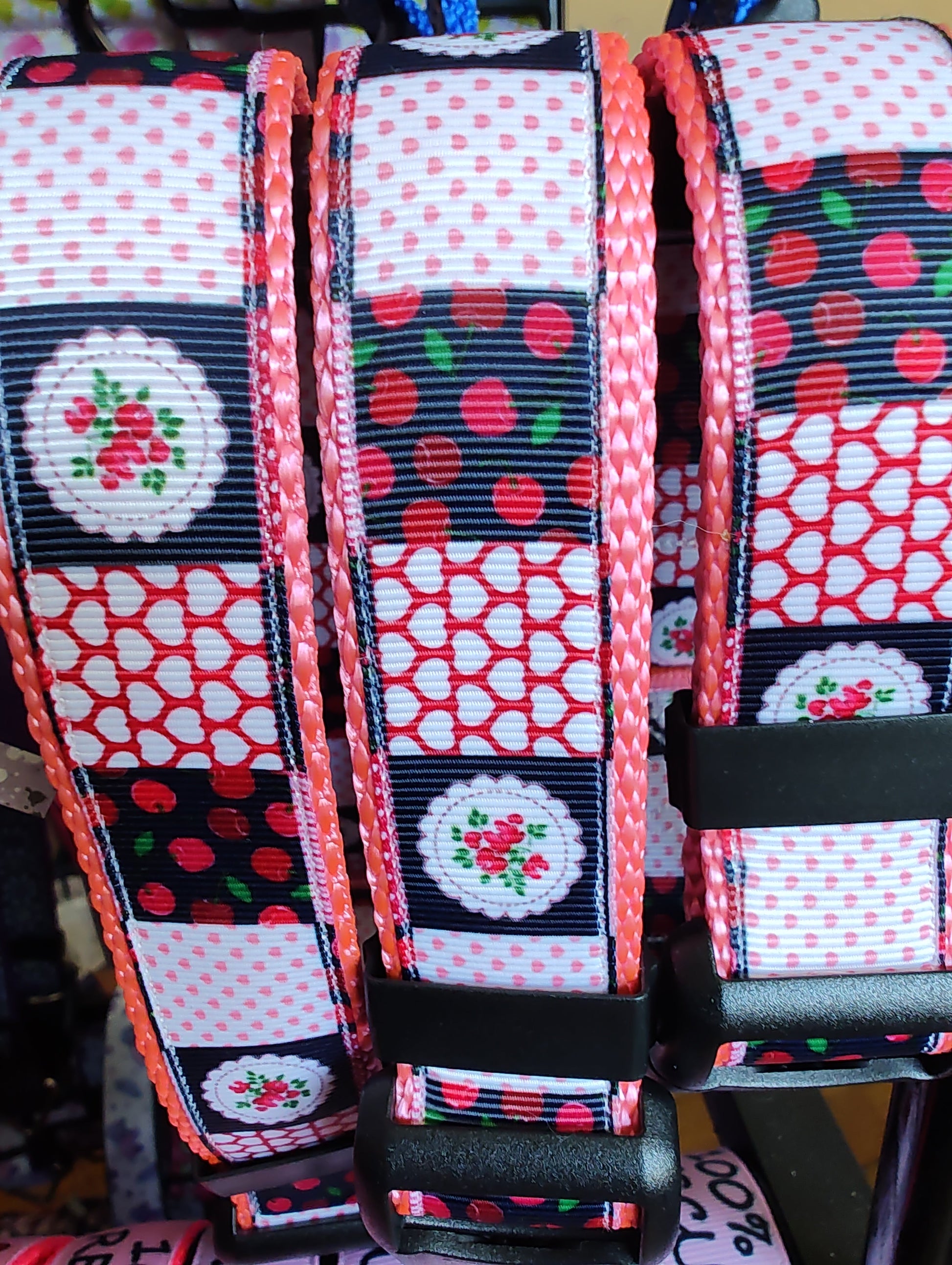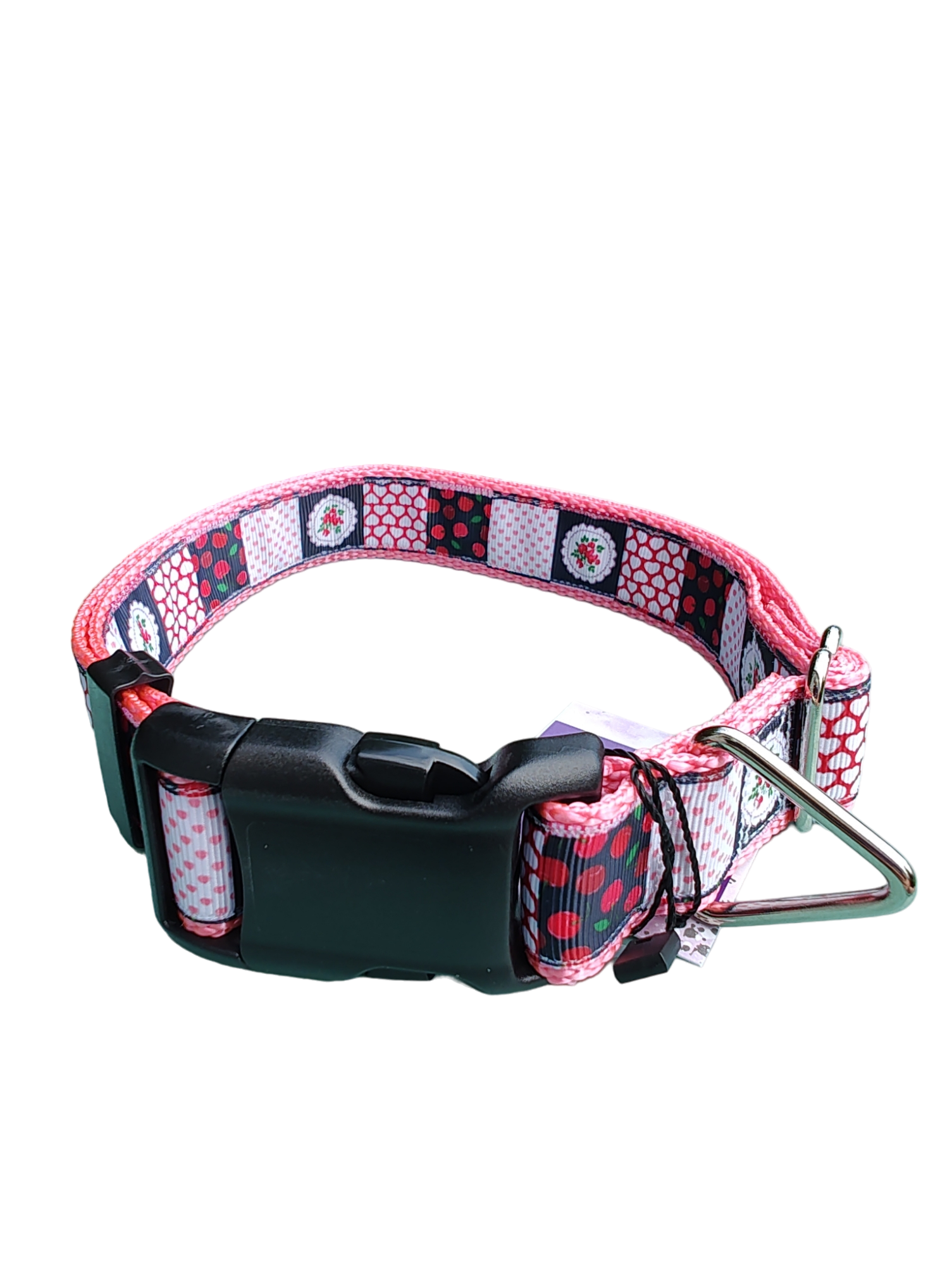 Patchwork Cherries Pink Nylon Dog Collar MD, LG, XL, Leash