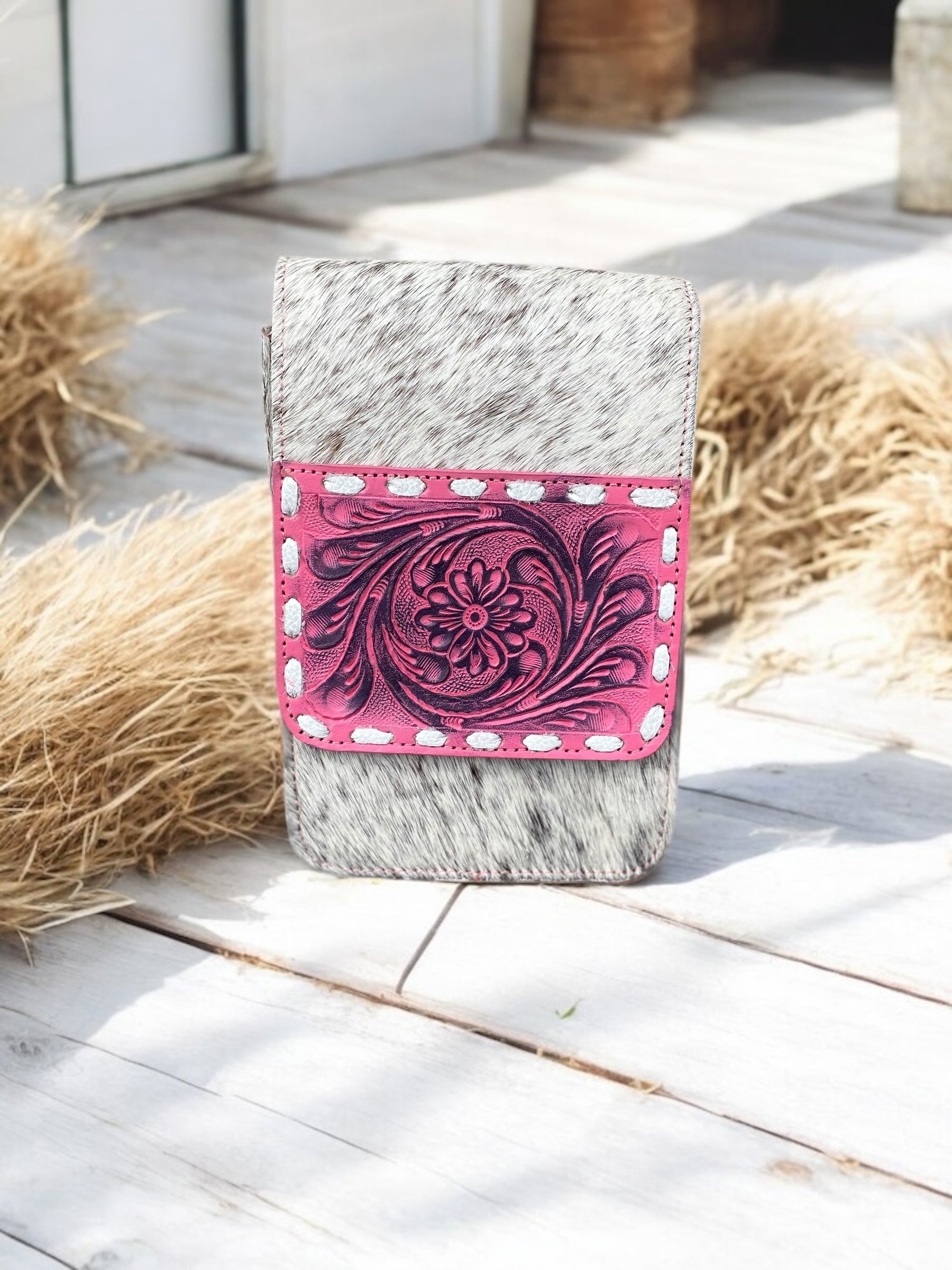 This Cowhide Crossbody with Tooled Leather is the ideal accessory for those who value both style and functionality. Crafted from high-quality cowhide, it offers a unique and durable design that stands out. The intricately tooled leather adds a touch of elegance, making it perfect for any occasion. With ample storage space for your phone, credit cards, and other essentials, this crossbody bag ensures you stay organized while on the go. Elevate your accessory game with this chic and practical piece.