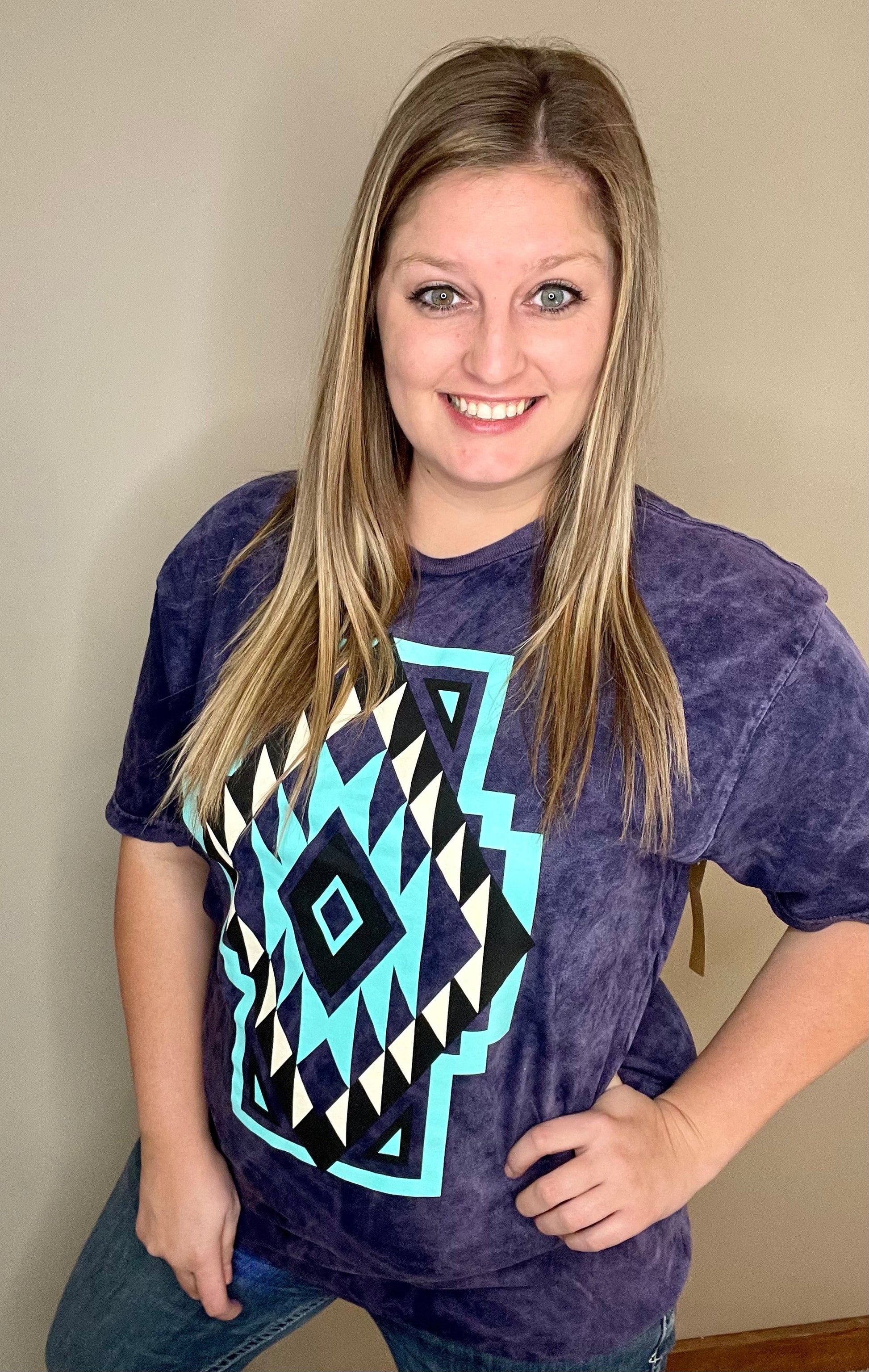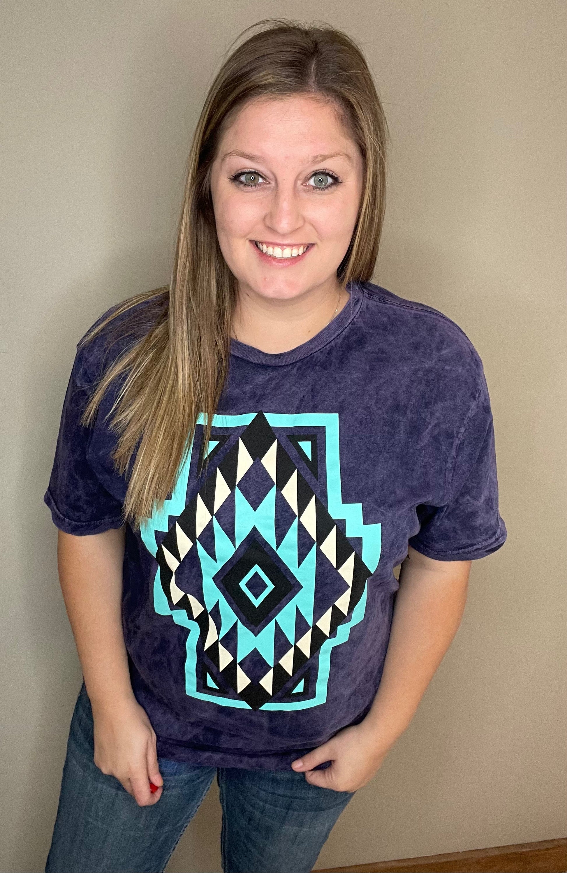 This top is to die for! This top has a bright Aztec pattern on a purple mineral washed base. This is sure to stand out in a crowd! It is so comfy, and runs true to size!