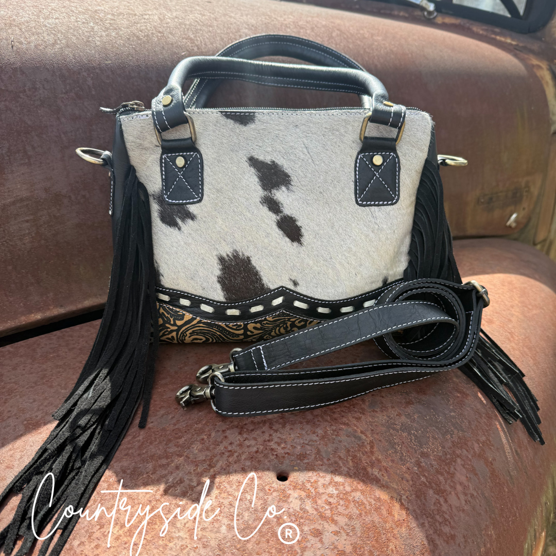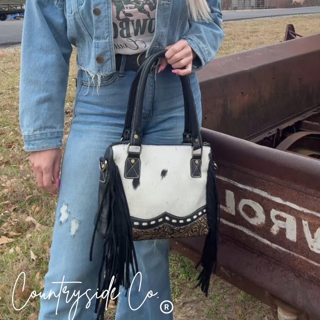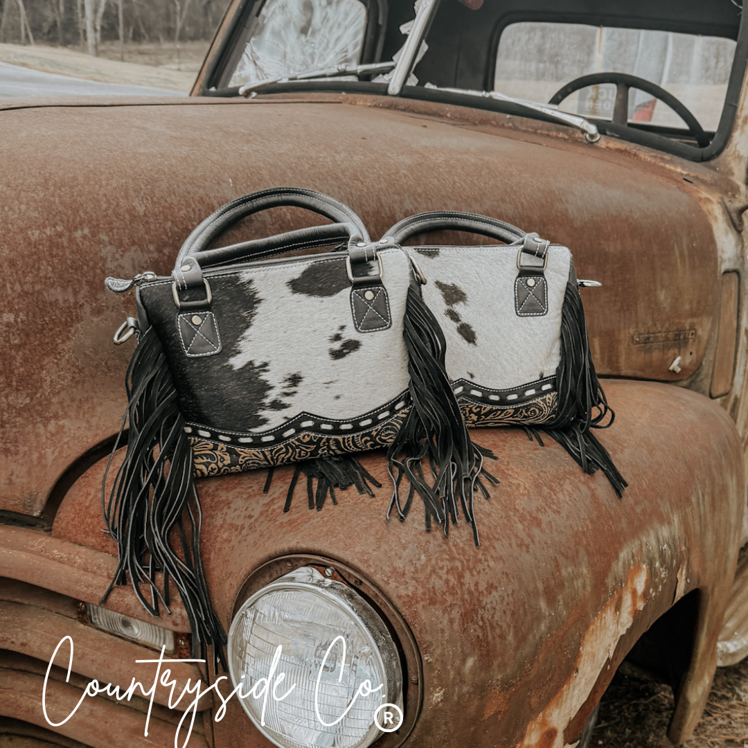 Experience luxury and convenience with the Priscilla Cowhide Conceal Carry Purse by Countryside Co.! This stunning purse features a detachable shoulder strap, front cowhide, embossed leather and detailed leather stitching. The leather back features a pocket for conceal carry. The inside keeps you organized with one side pockets, one side zipper pocket, and finished off with suede side fringe. Each bag is made of unique cowhides so no two alike