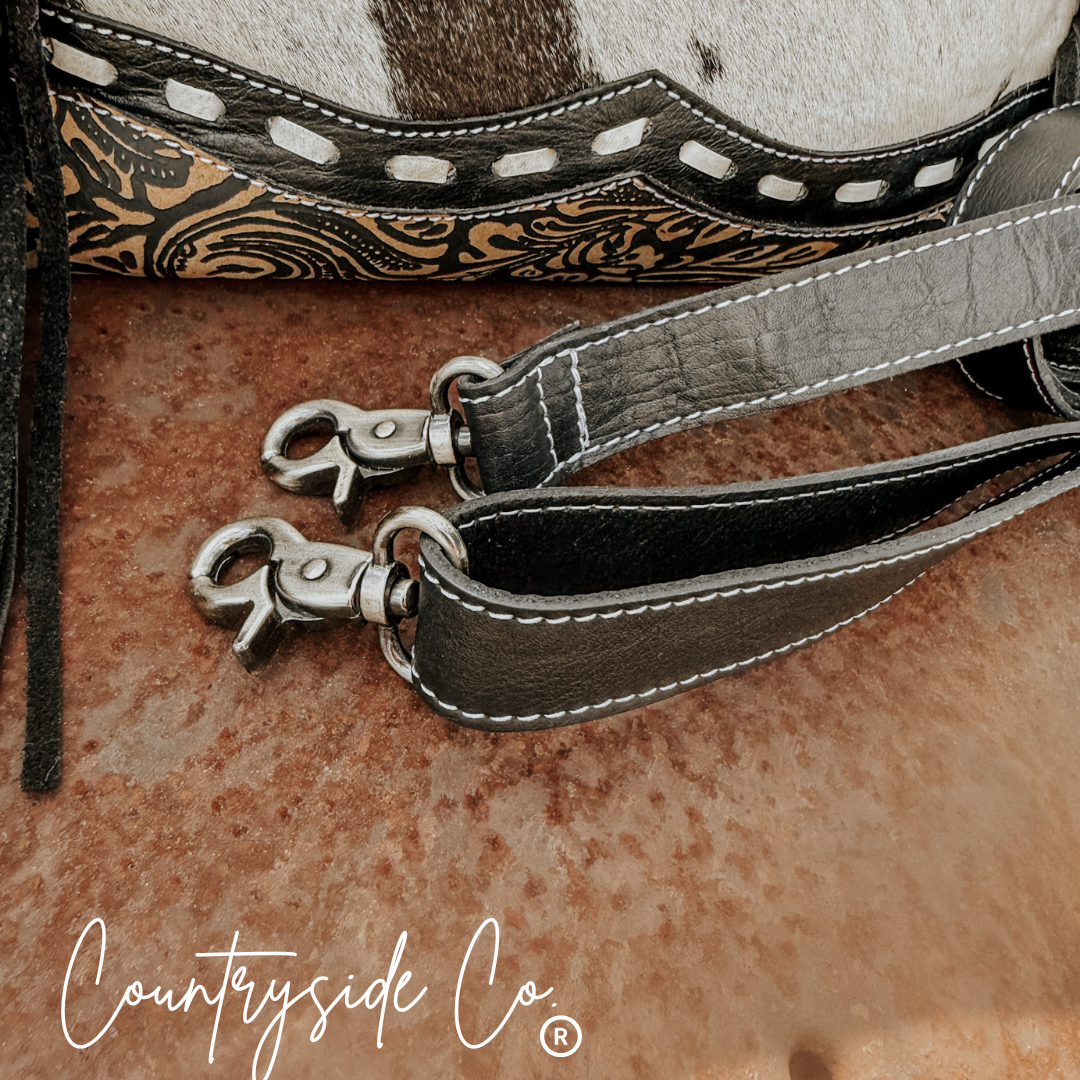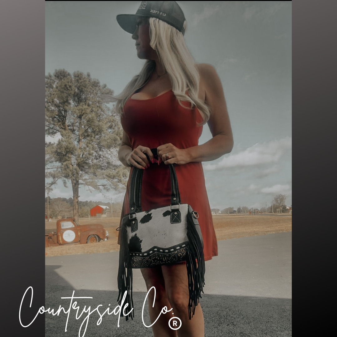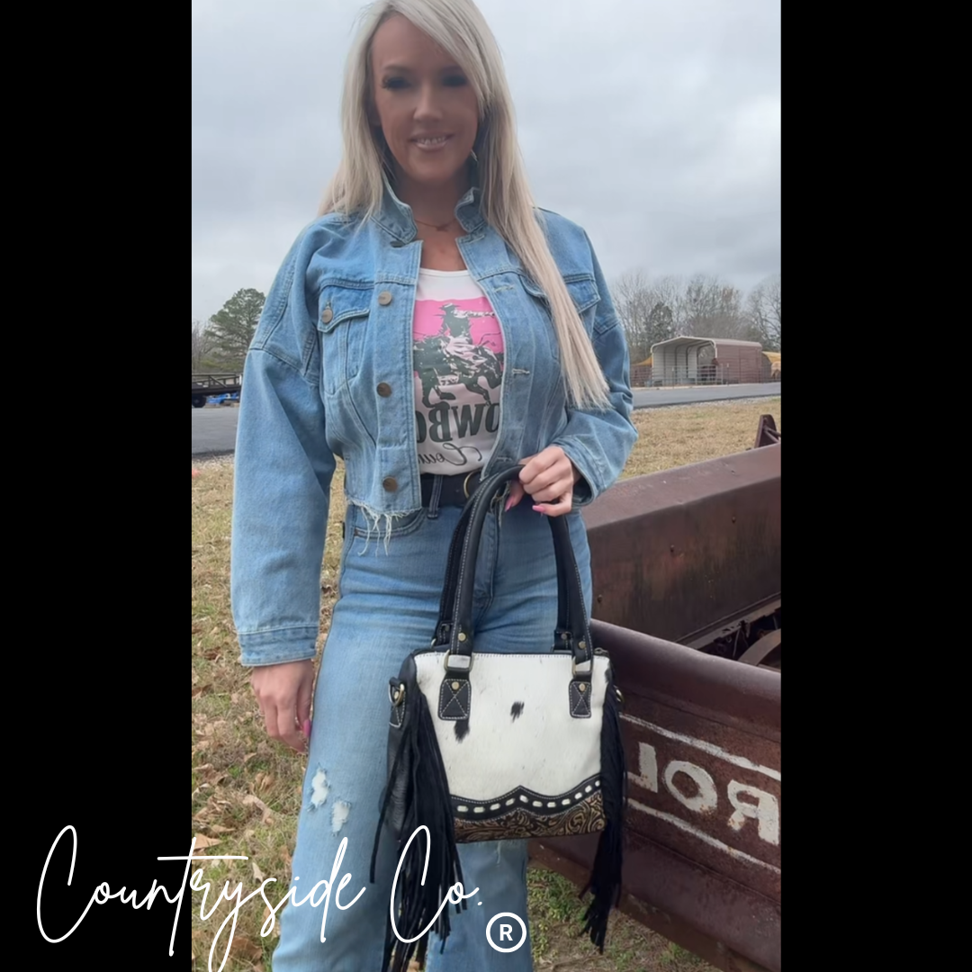Experience luxury and convenience with the Priscilla Cowhide Conceal Carry Purse by Countryside Co.! This stunning purse features a detachable shoulder strap, front cowhide, embossed leather and detailed leather stitching. The leather back features a pocket for conceal carry. The inside keeps you organized with one side pockets, one side zipper pocket, and finished off with suede side fringe. Each bag is made of unique cowhides so no two alike