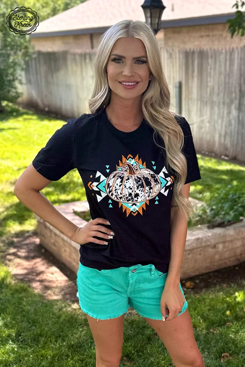 This PUMPKIN PICKIN' TEE is the perfect pick for pumpkin-lovers! Crafted with a black and white cowhide pattern, the tee features an aztec outline that stands out and lets you show off your stylish side. Now that's one pick-o-lantern you won't wanna pass up!