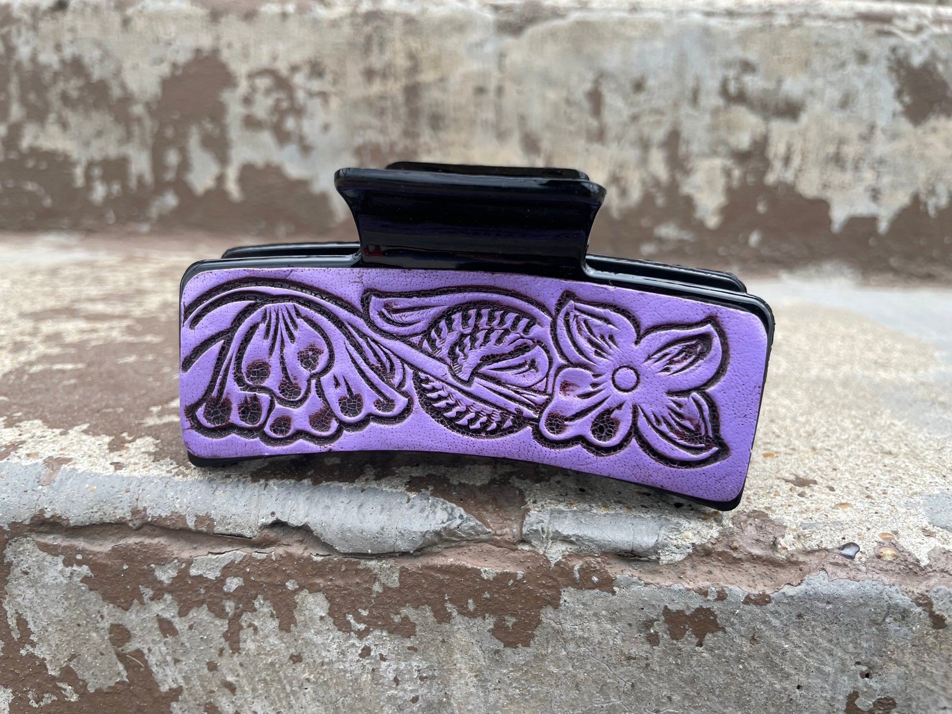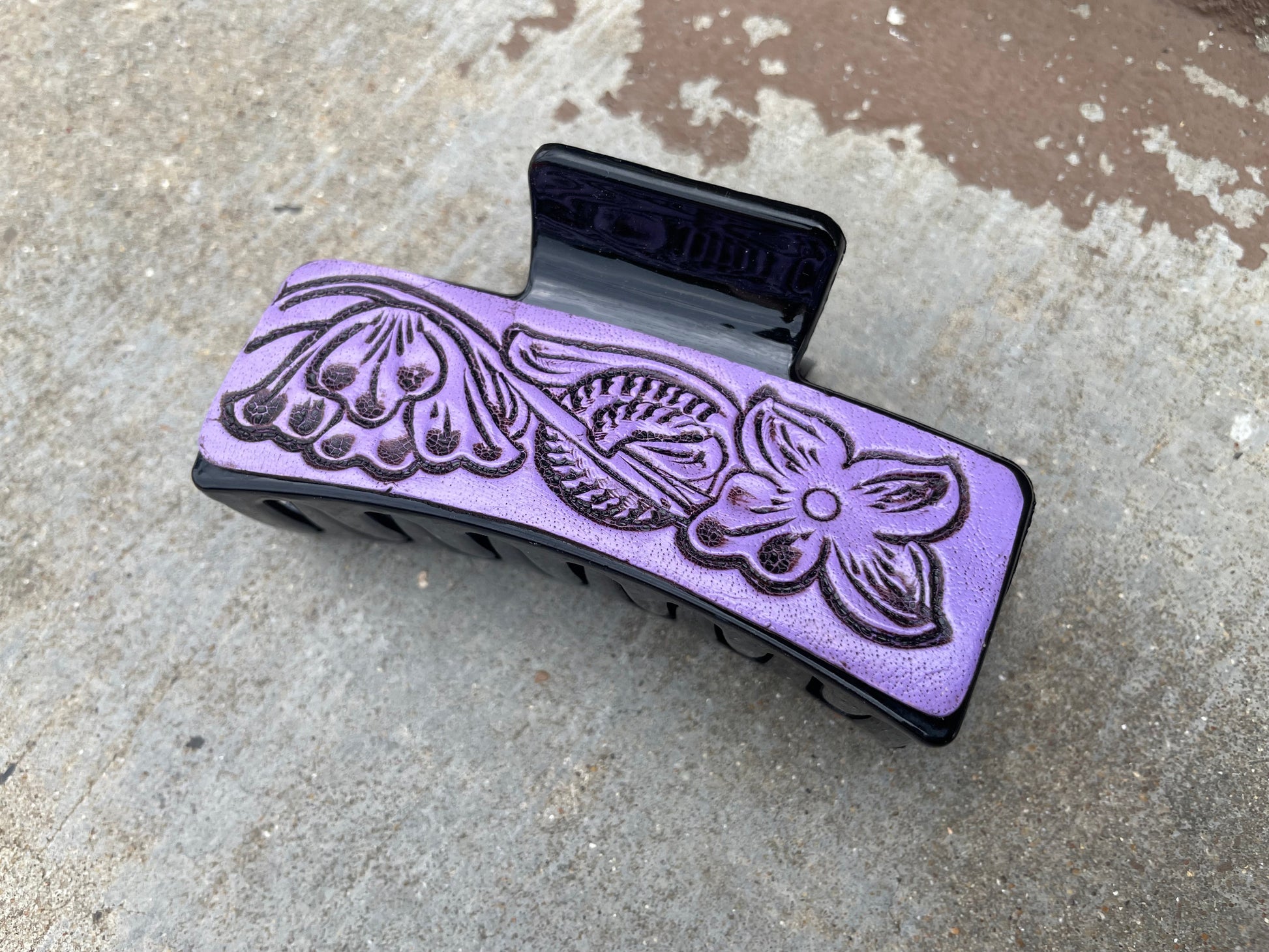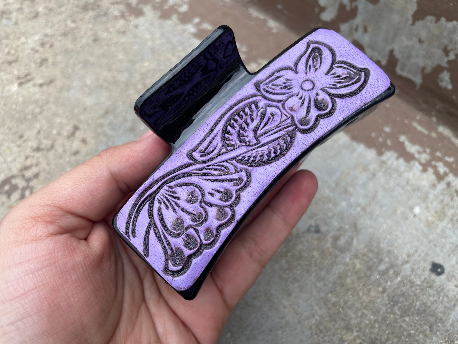 Purple Floral Tooled Leather Hair Claw Clips 4”