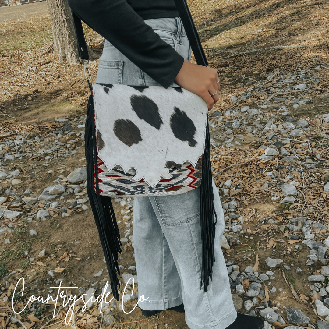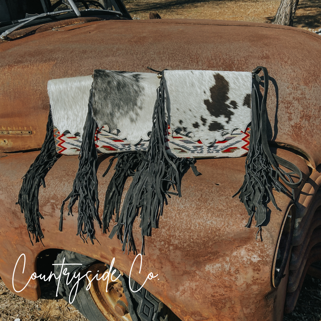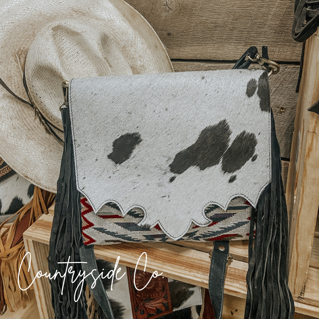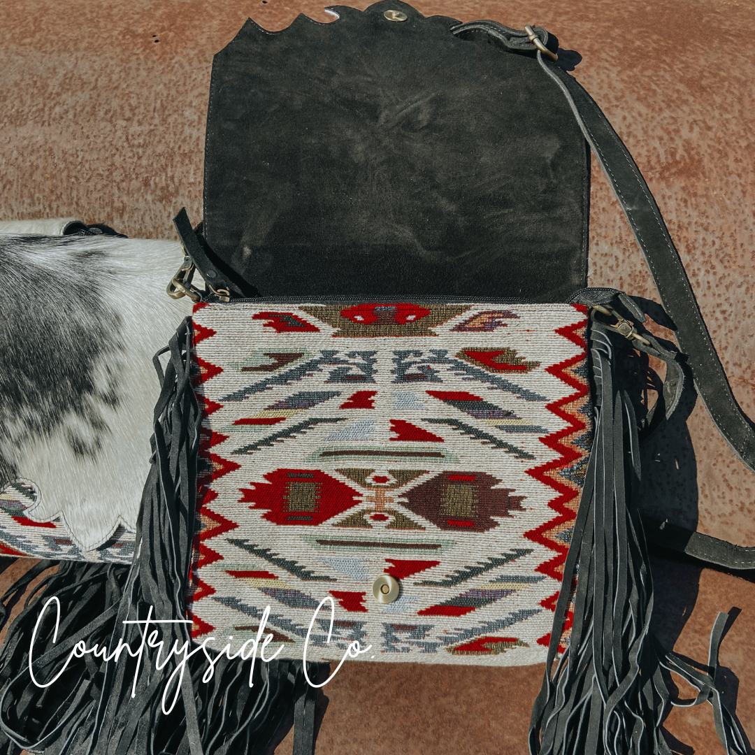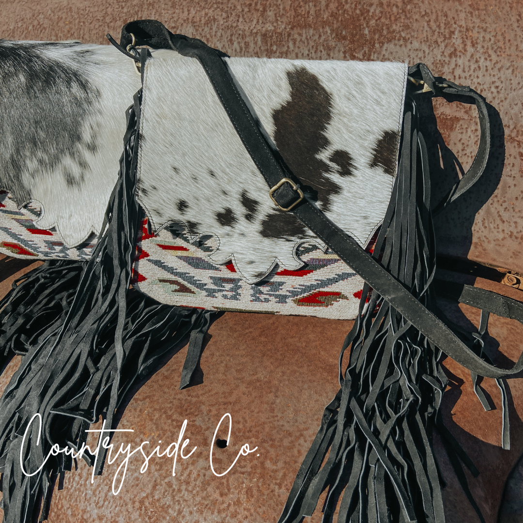 Elevate your style and stay organized with this Western-inspired purse that effortlessly blends fashion and function. The spacious cross-body design makes it a versatile choice for daily use, while the exquisite cowhide and vintage fabric front with a snap closure add a touch of exclusivity. Each purse is crafted with a unique cowhide, making it one-of-a-kind. Keep your belongings secure with the main zipper and take advantage of the two exterior concealed carry zipper pockets on the back, measuring 6 x 5.5 inches each. The adjustable suede leather shoulder strap ensures a comfortable and personalized fit. Embrace the unbeatable combination of vintage fabric patterns, cowhide, and fringe for a truly luxurious addition to your wardrobe. This purse measures 11 inches in width and 10 inches in height, perfect for all your essentials.
