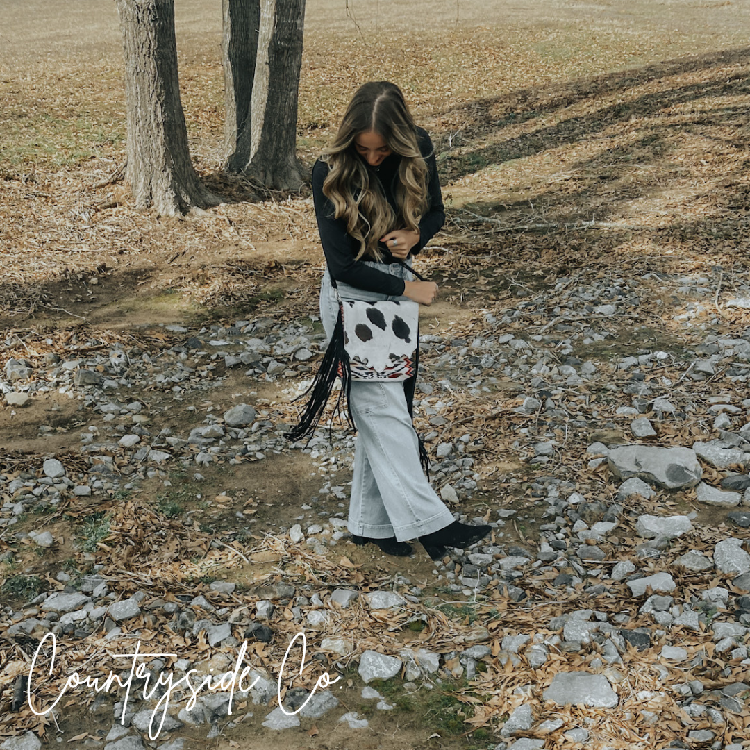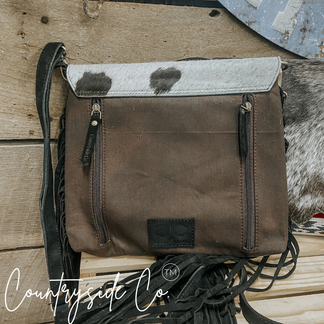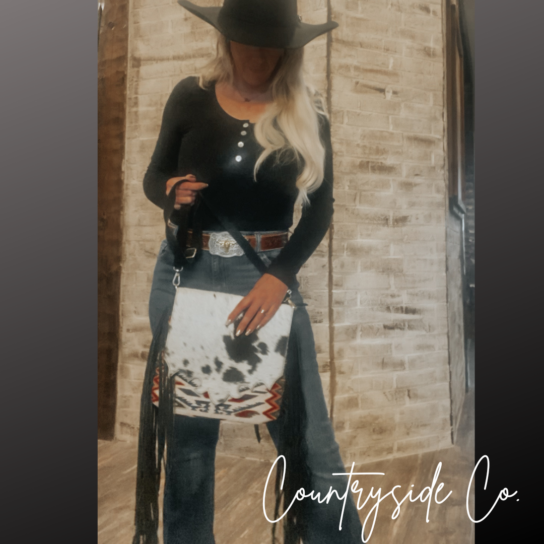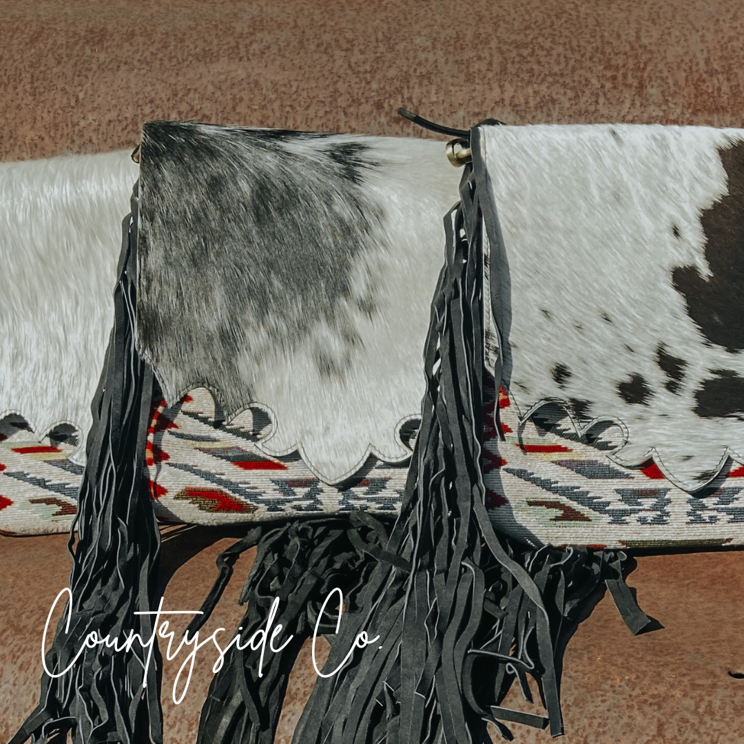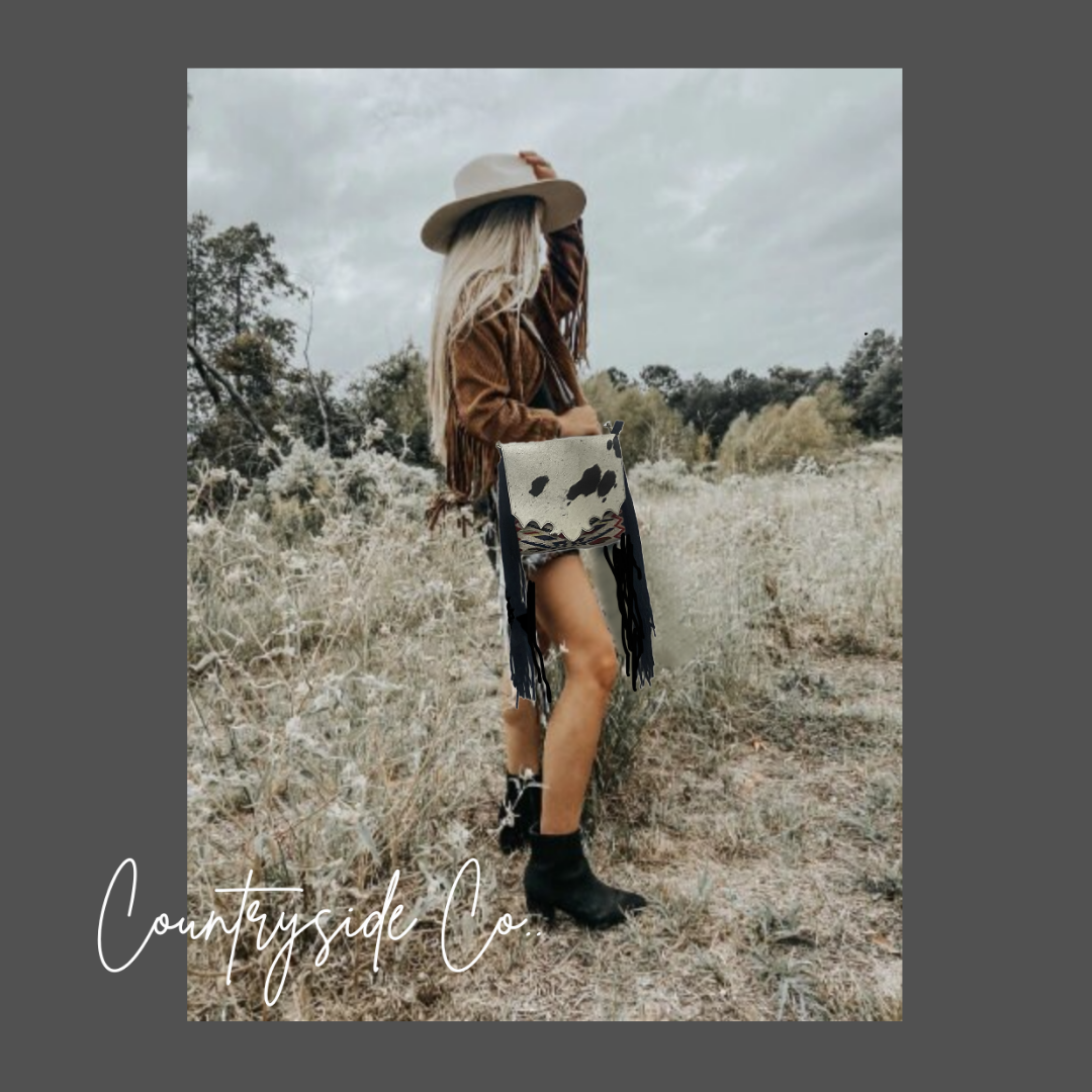 Elevate your style and stay organized with this Western-inspired purse that effortlessly blends fashion and function. The spacious cross-body design makes it a versatile choice for daily use, while the exquisite cowhide and vintage fabric front with a snap closure add a touch of exclusivity. Each purse is crafted with a unique cowhide, making it one-of-a-kind. Keep your belongings secure with the main zipper and take advantage of the two exterior concealed carry zipper pockets on the back, measuring 6 x 5.5 inches each. The adjustable suede leather shoulder strap ensures a comfortable and personalized fit. Embrace the unbeatable combination of vintage fabric patterns, cowhide, and fringe for a truly luxurious addition to your wardrobe. This purse measures 11 inches in width and 10 inches in height, perfect for all your essentials.