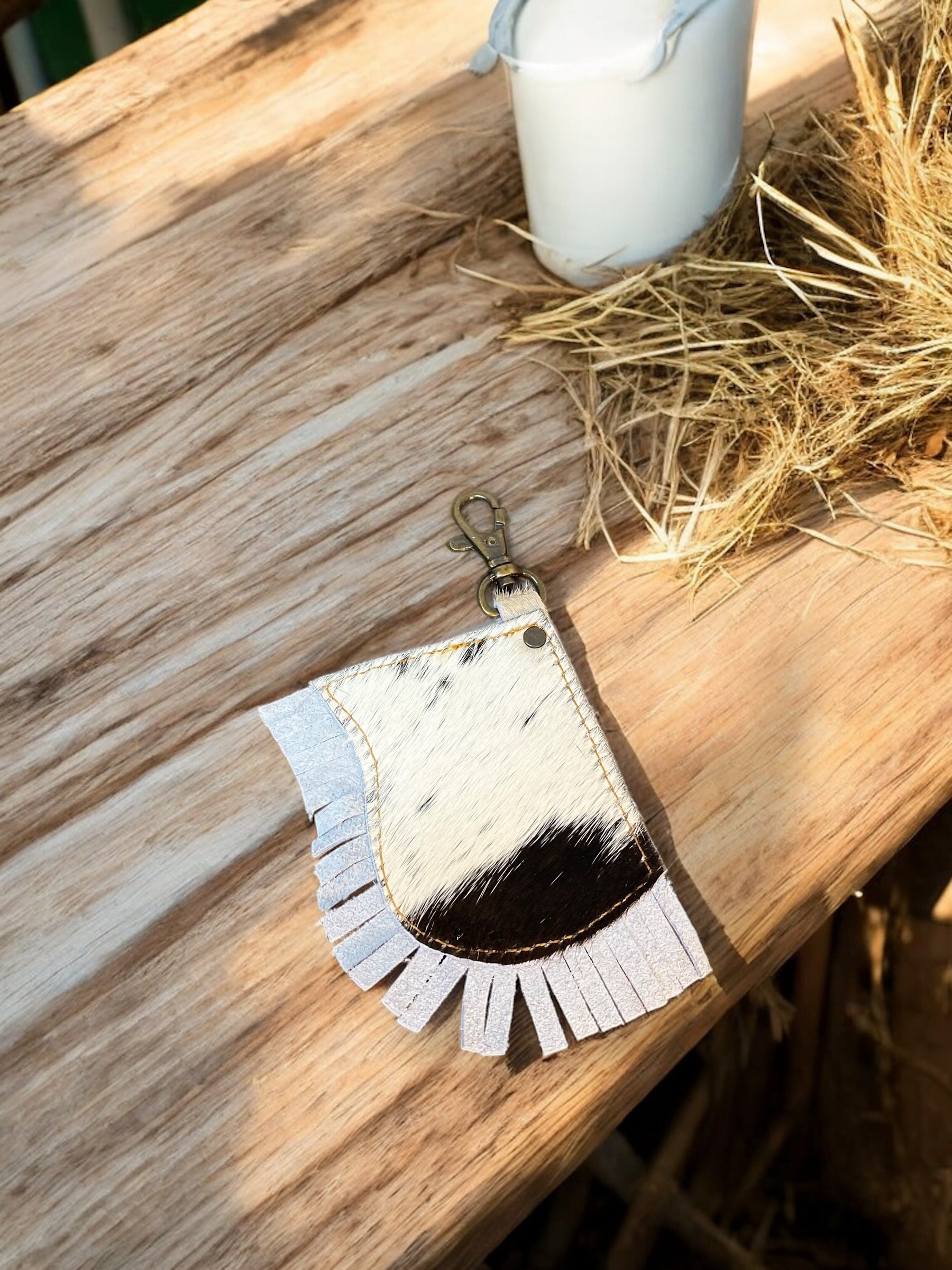 The Fringe Cowhide & Tooled Leather Keychain is a stylish and functional accessory, expertly crafted from high-quality cowhide and intricately tooled leather. Its unique fringe design adds a touch of bohemian flair, making it an eye-catching addition to your keys or bag. Durable and lightweight, this keychain not only ensures the security of your keys but also enhances your personal style with its distinctive texture and craftsmanship. Perfect for everyday use or as a thoughtful gift, it embodies both practicality and aesthetic appeal.