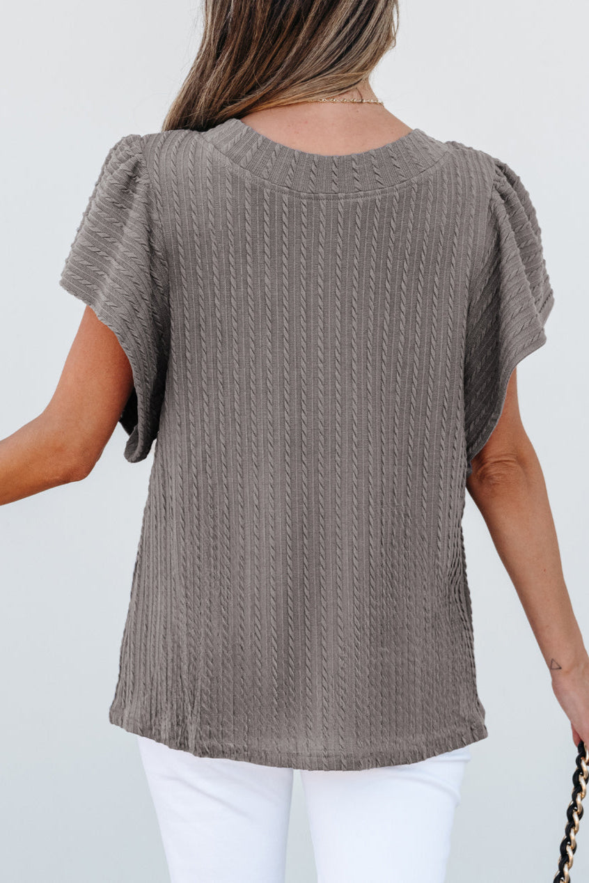 This sophisticated knit top blends textured cable fabric with delicate flutter sleeves to create a refined silhouette. Thoughtful shirring adds a flattering drape, while the solid hue offers endless styling versatility. Expertly crafted to balance comfort and elegance, this versatile piece effortlessly elevates both casual and semi-formal looks. Polyester/Spandex