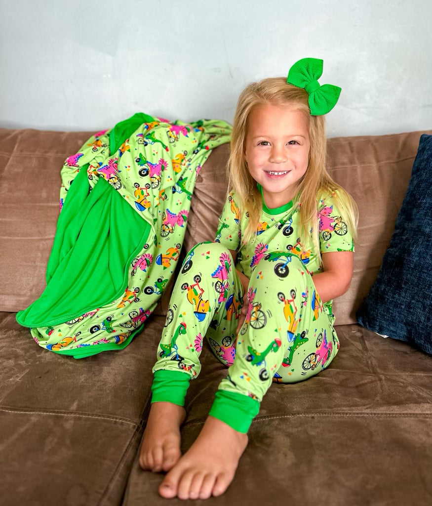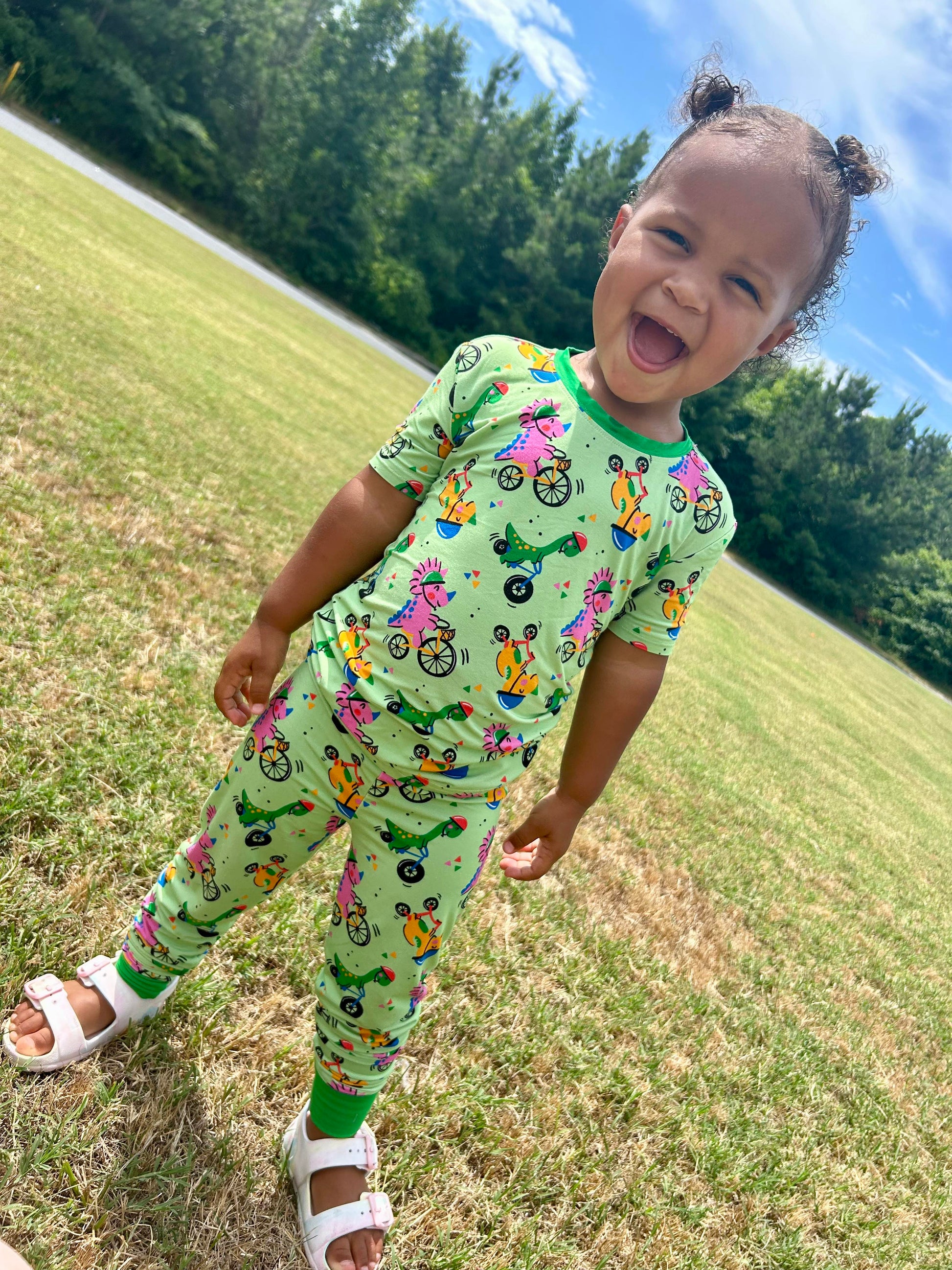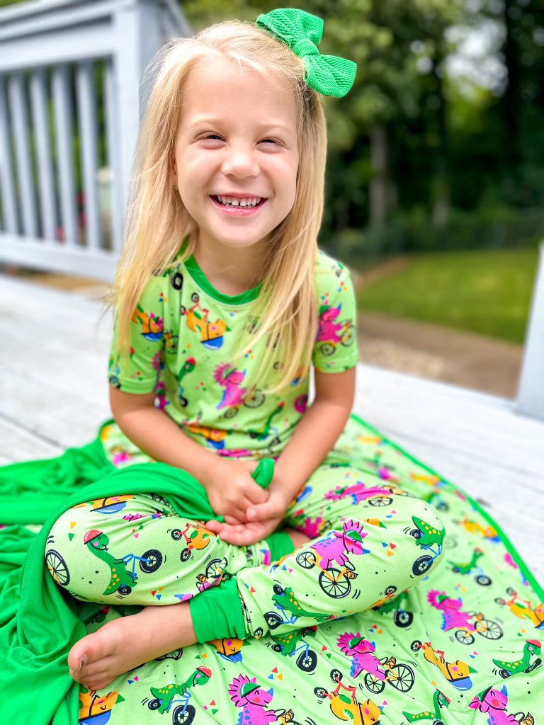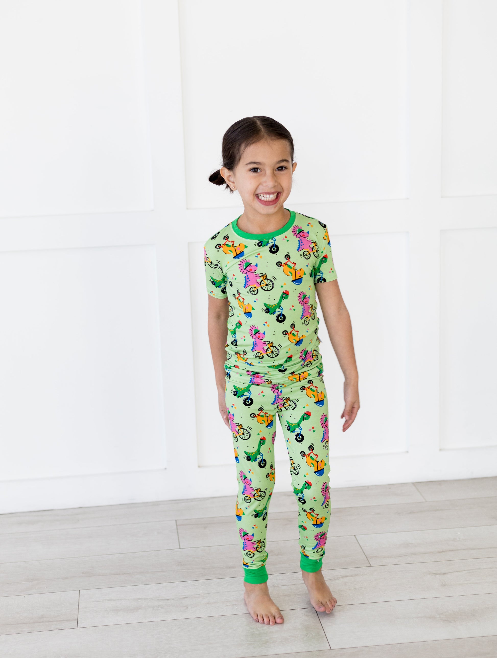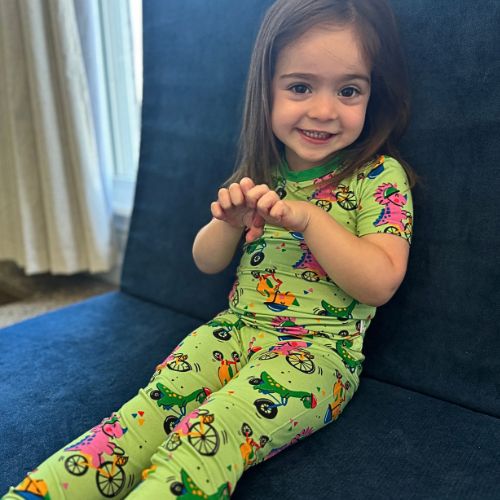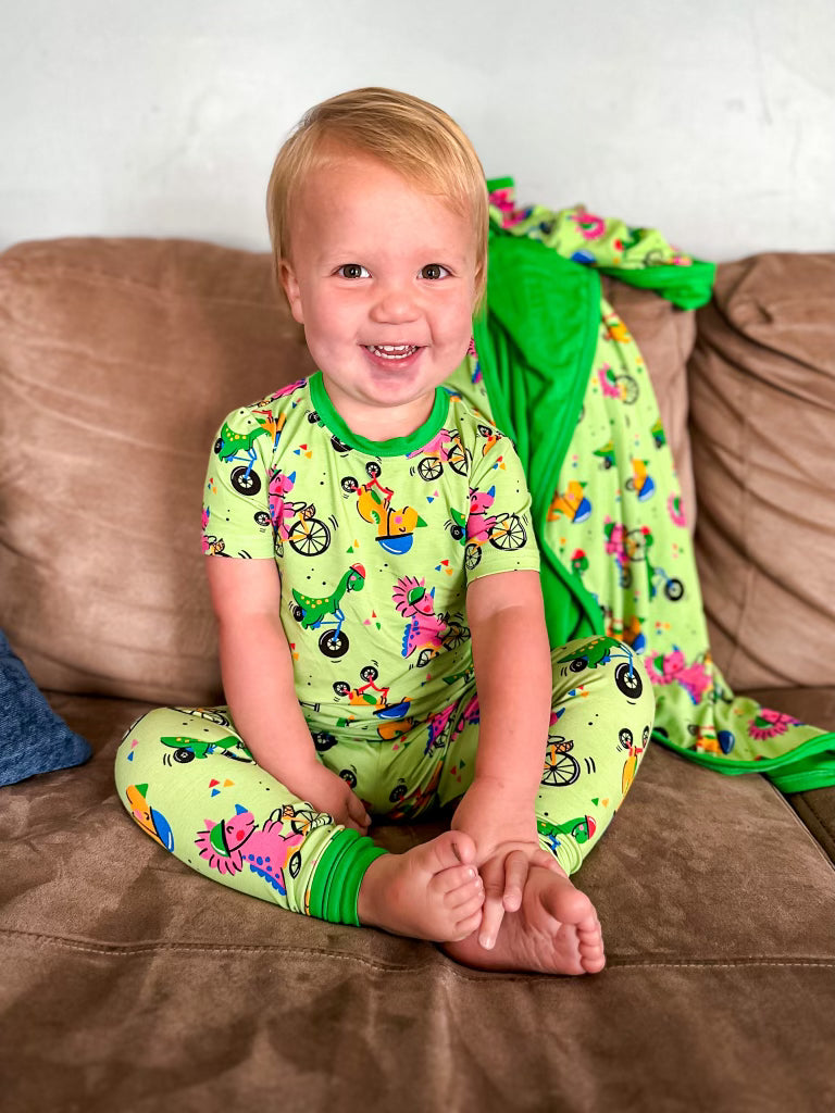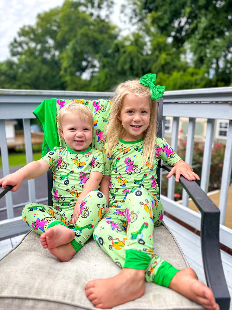 Introducing the print of dinosaurs joyfully riding bikes, our pajama set adds a playful and delightful touch to bedtime routines.Step into a world of imaginative comfort with our innovative bamboo pajama set, specially designed for babies who require tube feeding with easy access. Crafted from luxurious bamboo fabric, these pajamas offer a silky-smooth feel against their delicate skin, ensuring unparalleled comfort and warmth throughout the night. Ideal for sensitive skin, bamboo fabric is hypoallergenic and gentle, providing soothing softness for little ones.