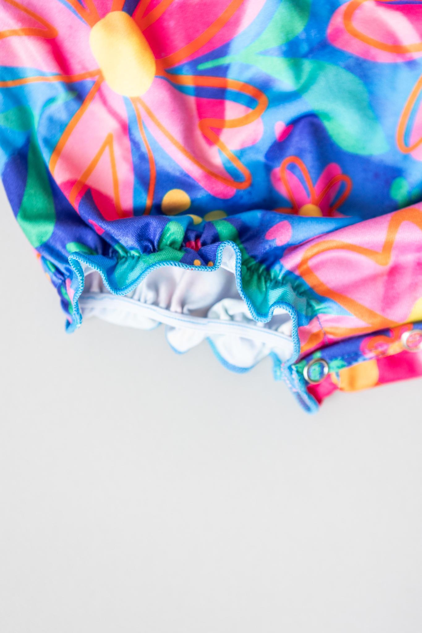 Our Ruffle Cross Back Romper is perfect for summer! Straps criss cross in the back with a sweet ruffle on the shoulder. Snaps for easy diaper changes.