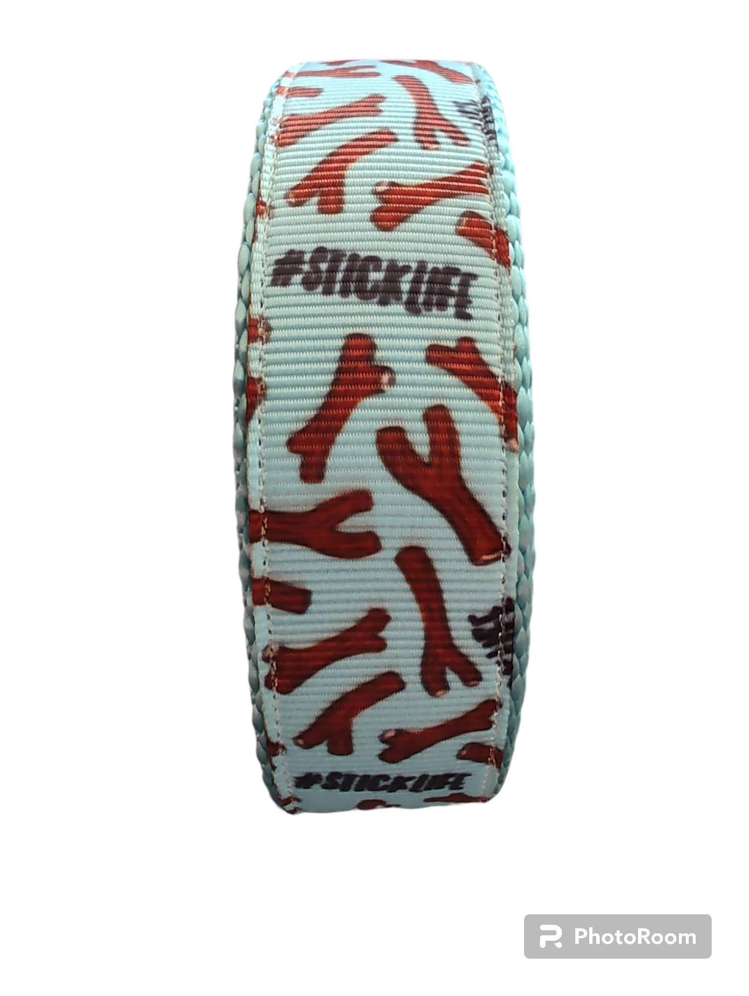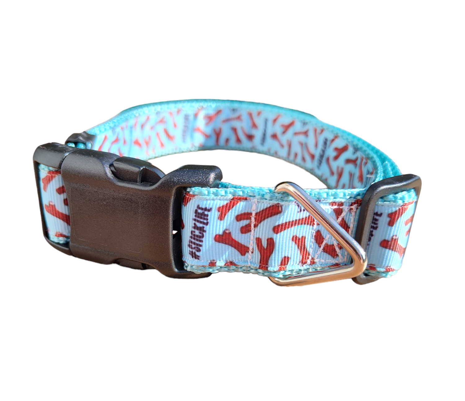 # Stick Life dog collar on light blue nylon webbing