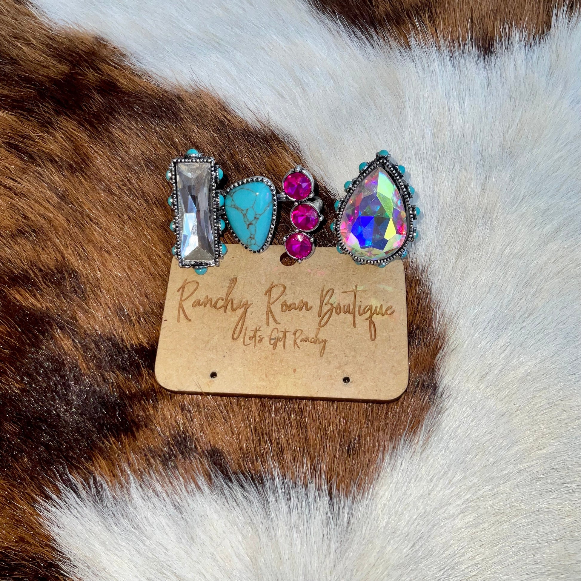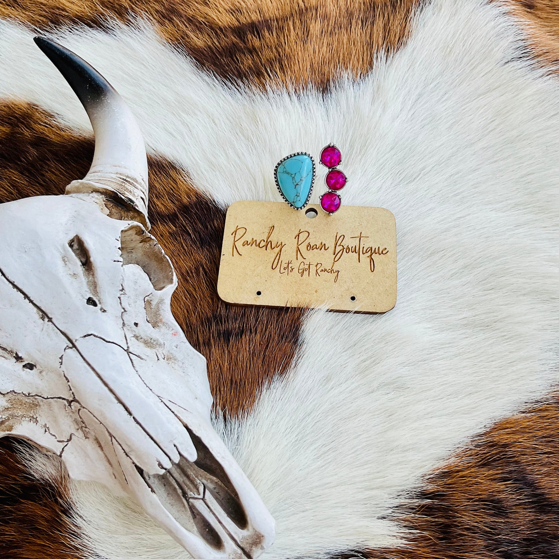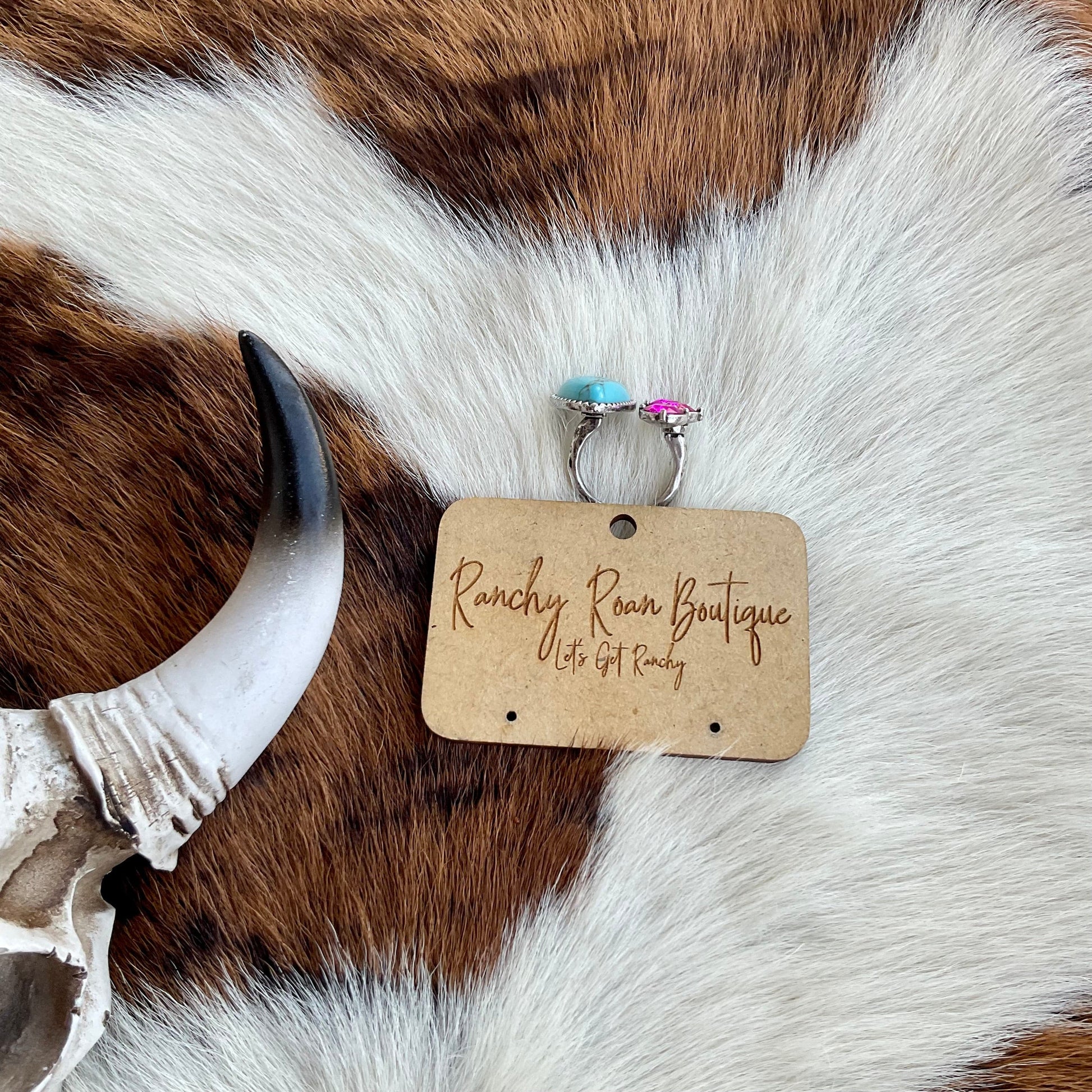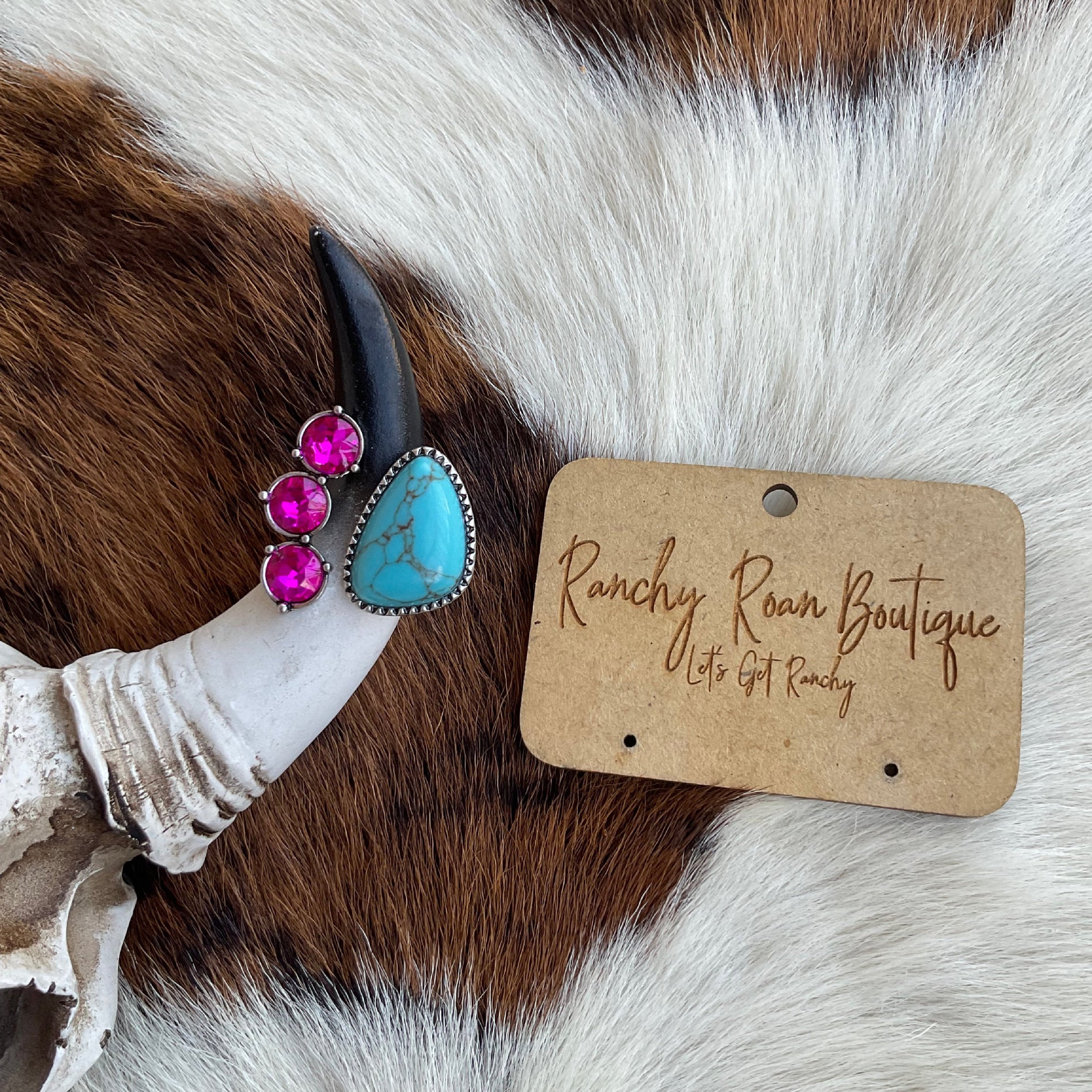 This Stone Cuff Western Ring exudes cowboy style with its burnished silver and turquoise color, finished with a vibrant fuchsia stone. Show off your inner cowgirl with this gorgeous conversation-starter!