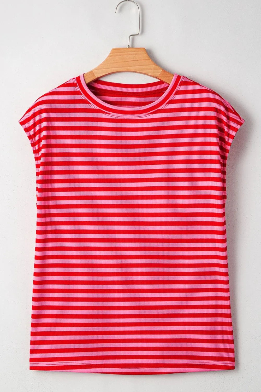 Stripe Ribbed Cap Sleeve Round Neck T Shirt