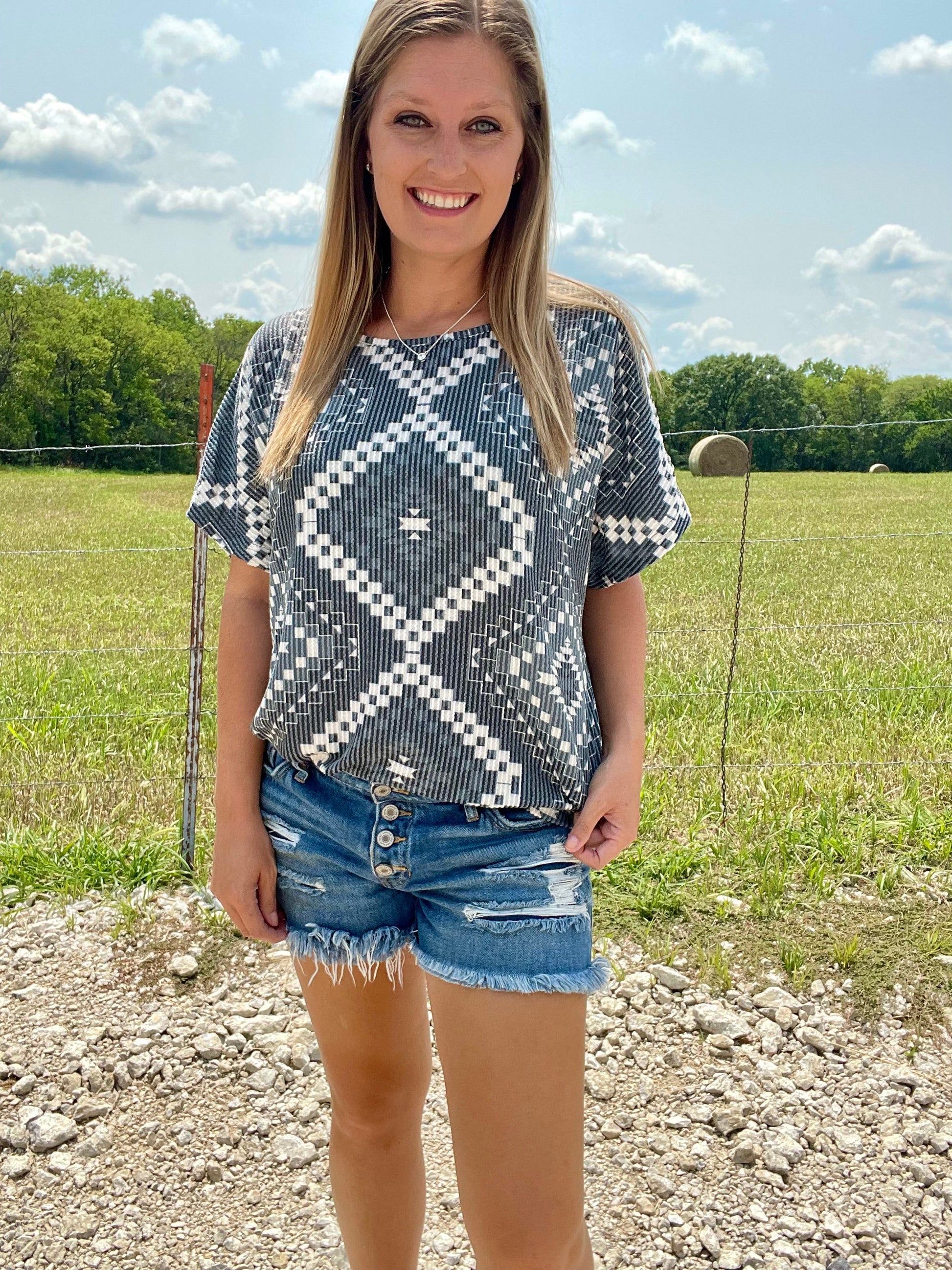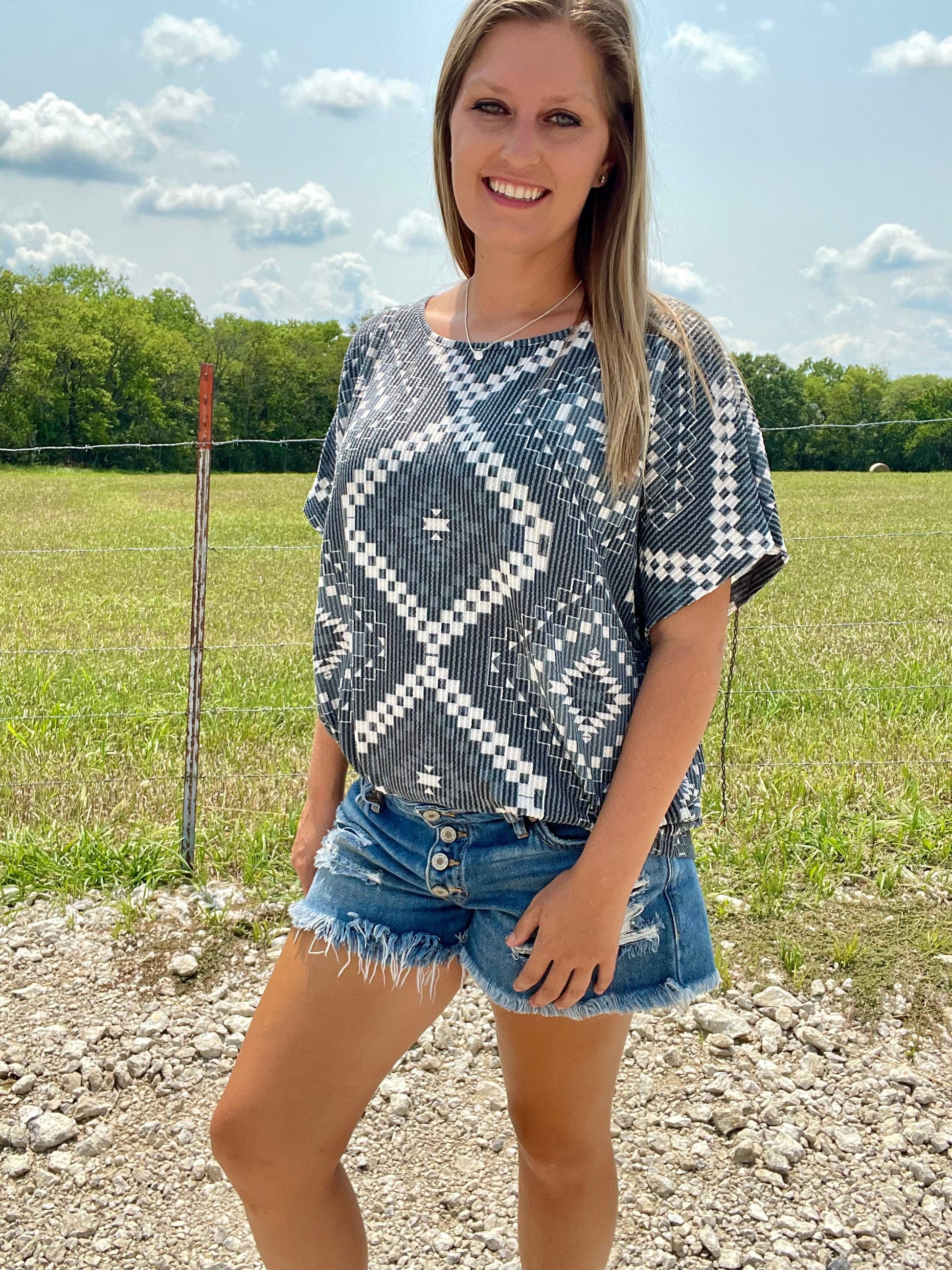 Embrace a slower pace with our Take It Slow Top. In a chic black, gray, and white Aztec design, this top offers an oversized fit for ultimate comfort. Perfect for laid-back days and cozy nights in. Slow and steady wins the style race with this top. (Pun intended).
