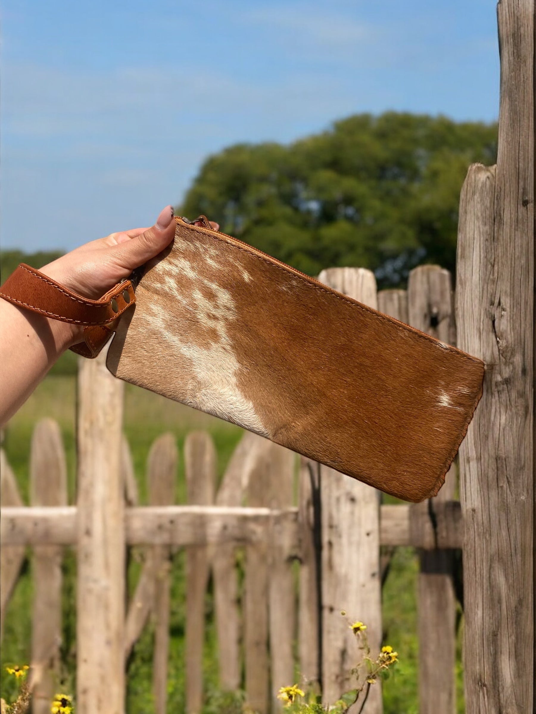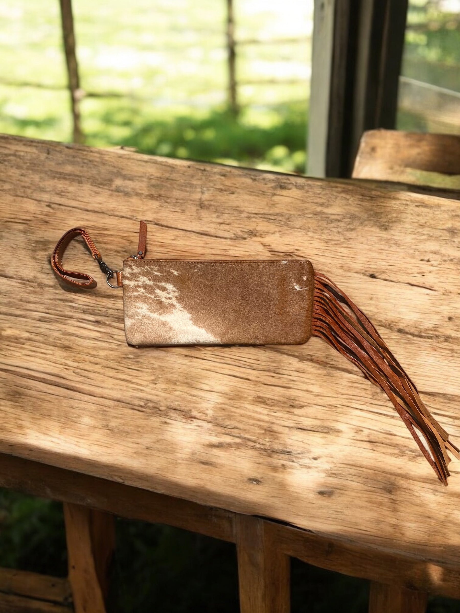 Experience the perfect blend of style and functionality with our Long Fringe Wristlet crafted from premium cowhide leather. This chic accessory features a stunning long fringe design that adds a touch of bohemian flair to any outfit. The spacious interior provides ample room for your essentials, while the secure zipper closure ensures everything stays safe.