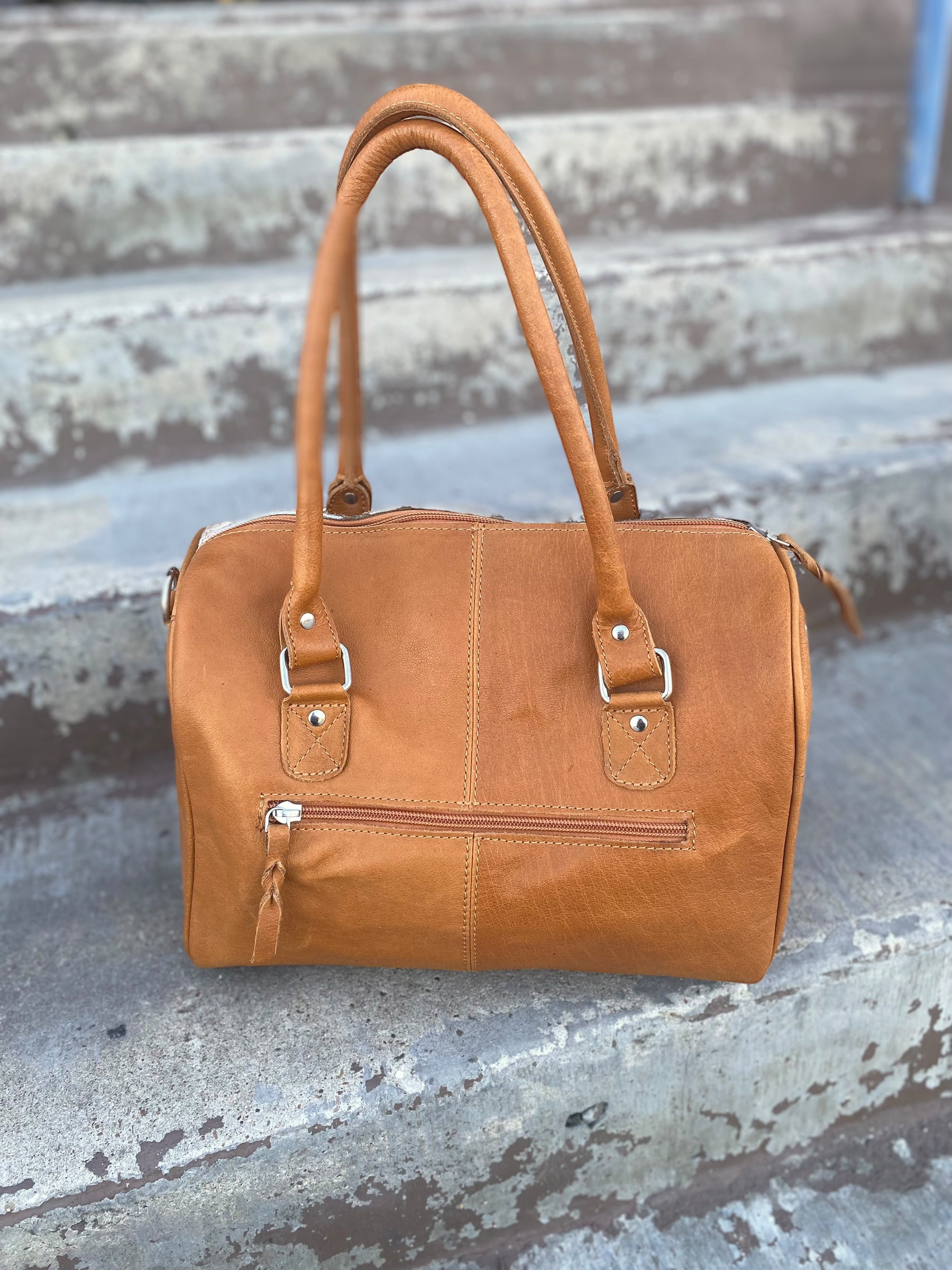 We are so excited to share our new popular speedy bag, this is a perfect size duffle bag that comes with our signature cowhide flower belt handles for multiples purpose use.