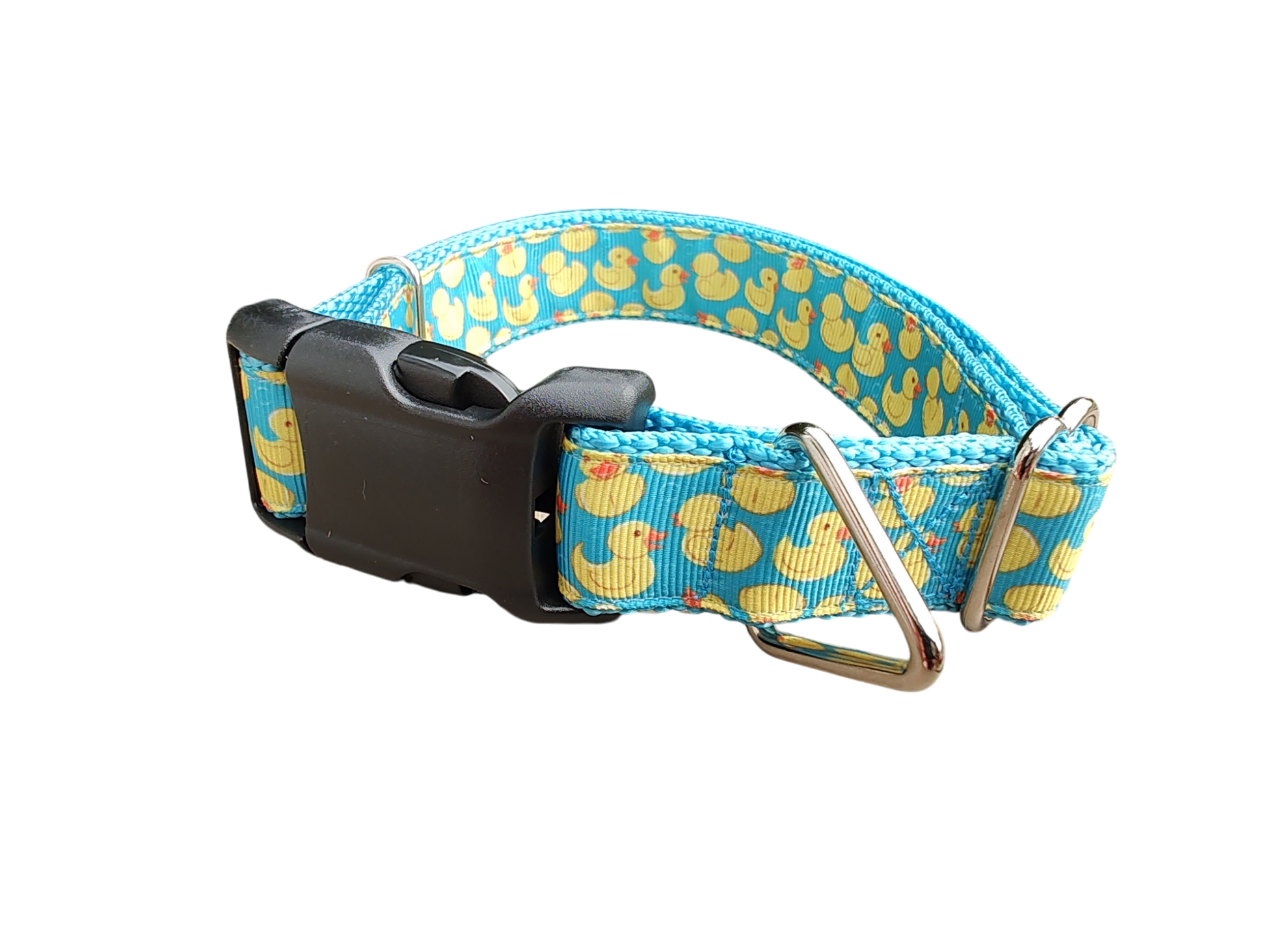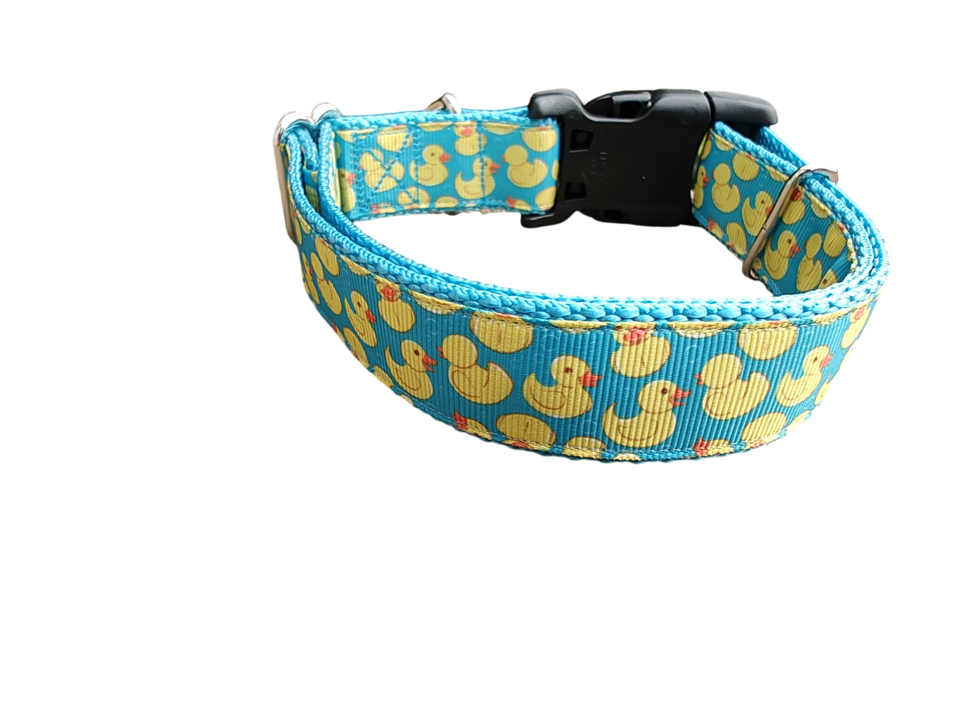 Teal Rubber Duckies dog collar on nylon webbing