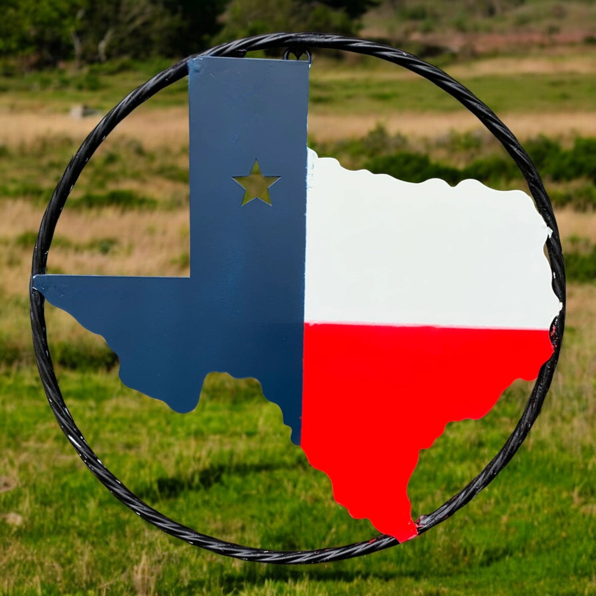 Show off your Texas pride with our Texas Map Metal Sign with Rope Ring. This charming patriotic accent features a detailed outline of the Texas map artfully encircled by a decorative rope ring and finished in bold red white and blue. Perfect for adding a burst of patriotic flair to your home office or cabin this compact sign is a stylish nod to Texan heritage.