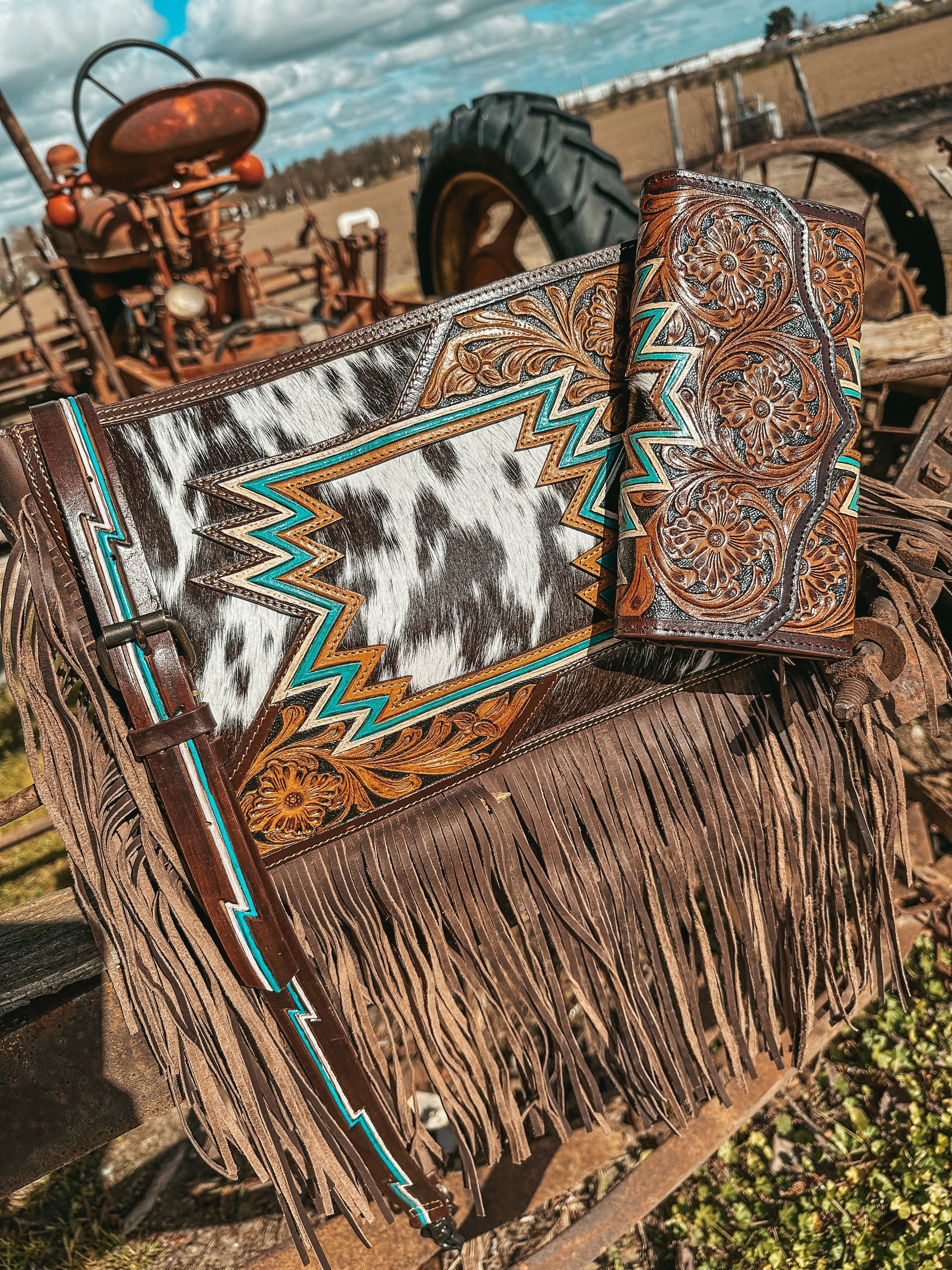 Introducing The Cowgirl Ziggy, a Haute Southern Hyde by Beth Marie Exclusive Cowhide Purse. This is an eye grabber with a unique Aztec tooling you aren’t going to see anywhere else.