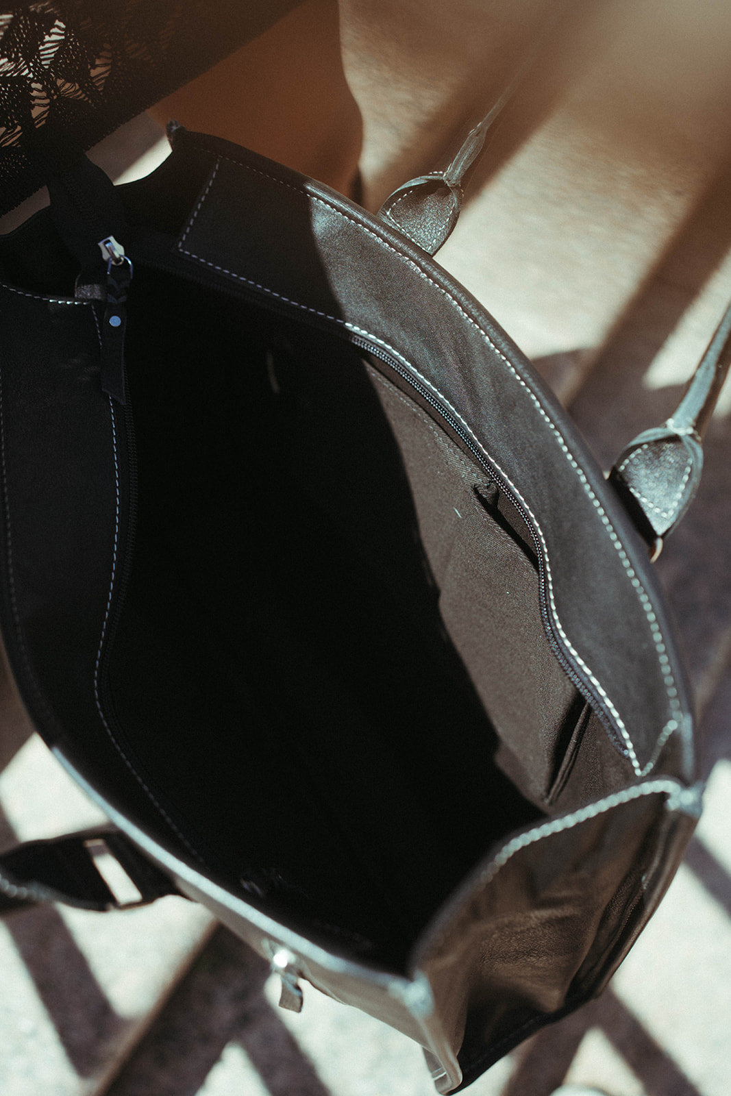 Interior features two cubby pockets and one zipper pocket. The rear boasts two vertical zippers for your weapon.