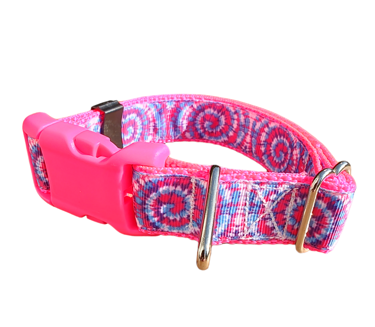 Tie Dye dog collar on hot pink nylon webbing