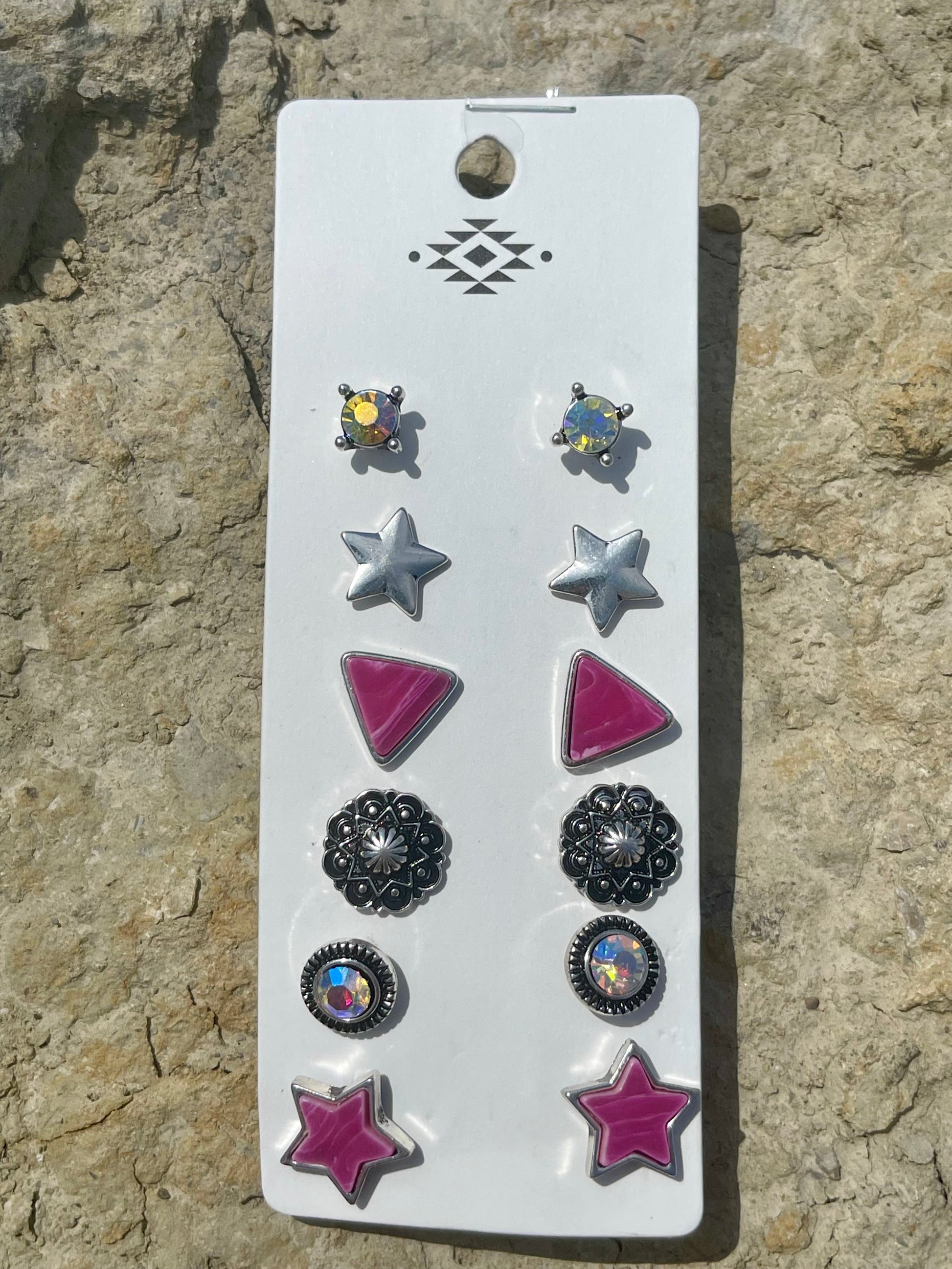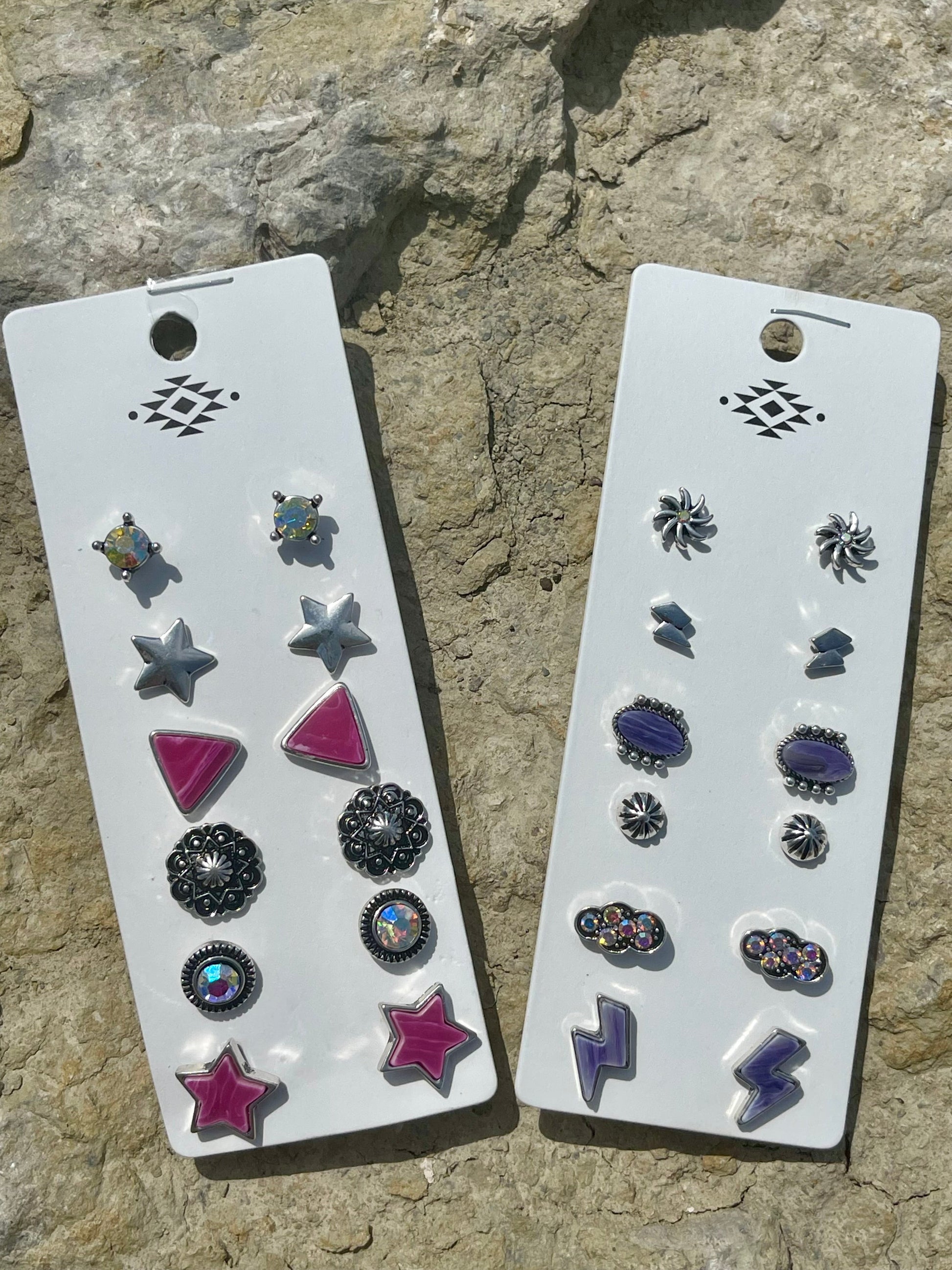 "Get ready for some earring fun with our 'To Many Choices' pack! Choose from 6 pink or purple earrings, perfect for little ones or those with multiple piercings. Because why settle for one when you can have many?!"