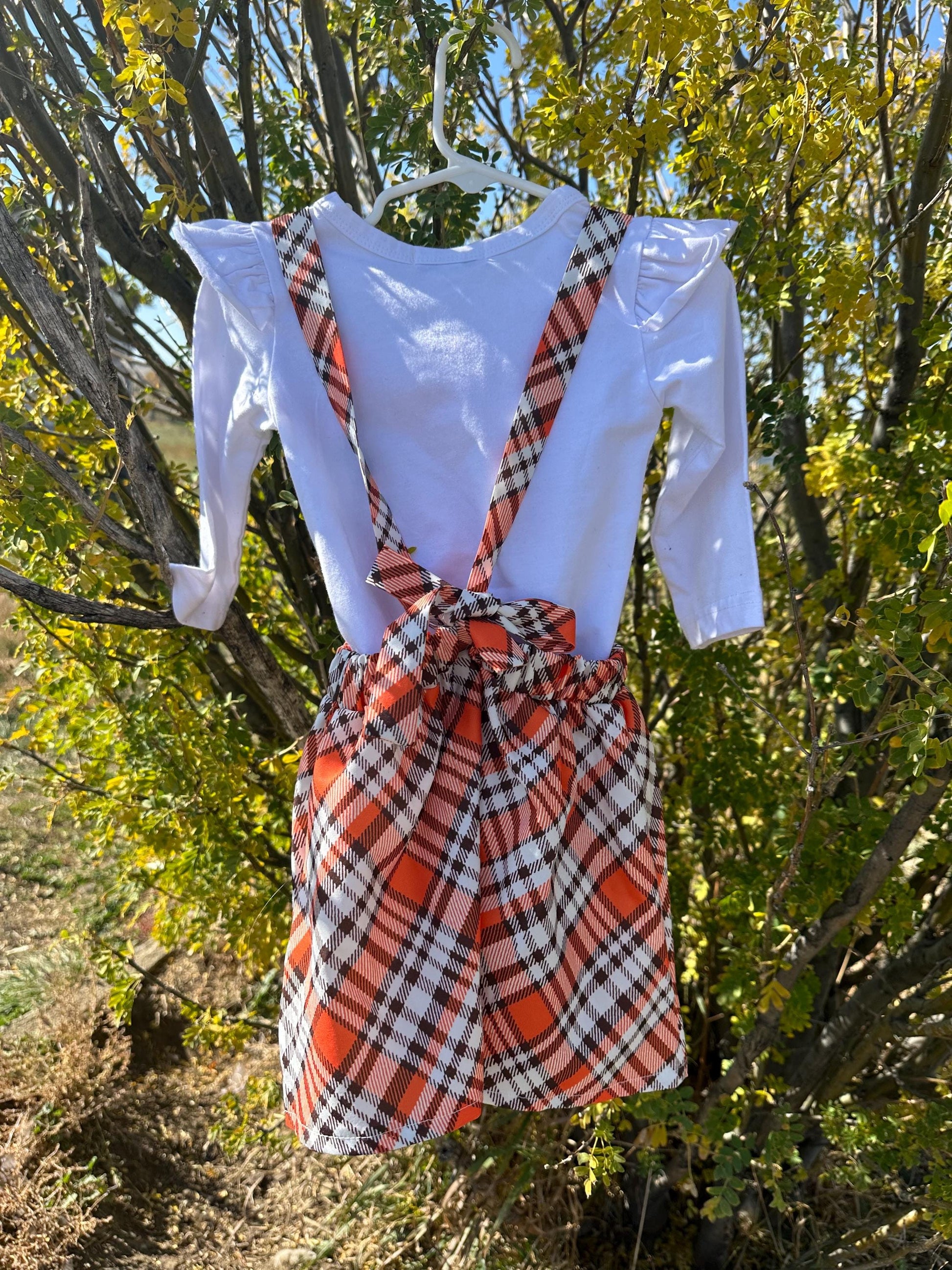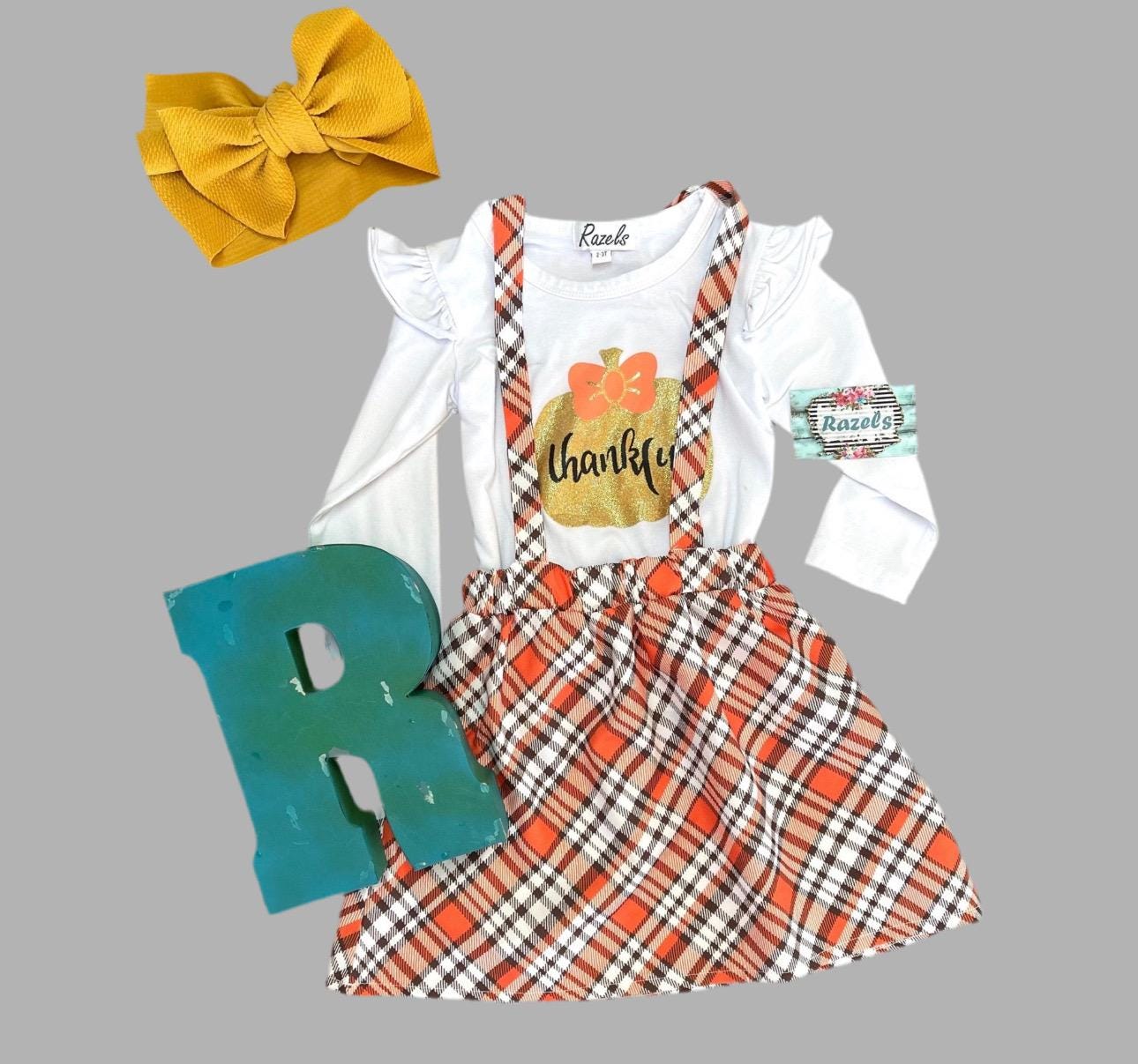 Materials: Thankful Pumpkin Shirt, Fall Plaid Suspender Skirt.