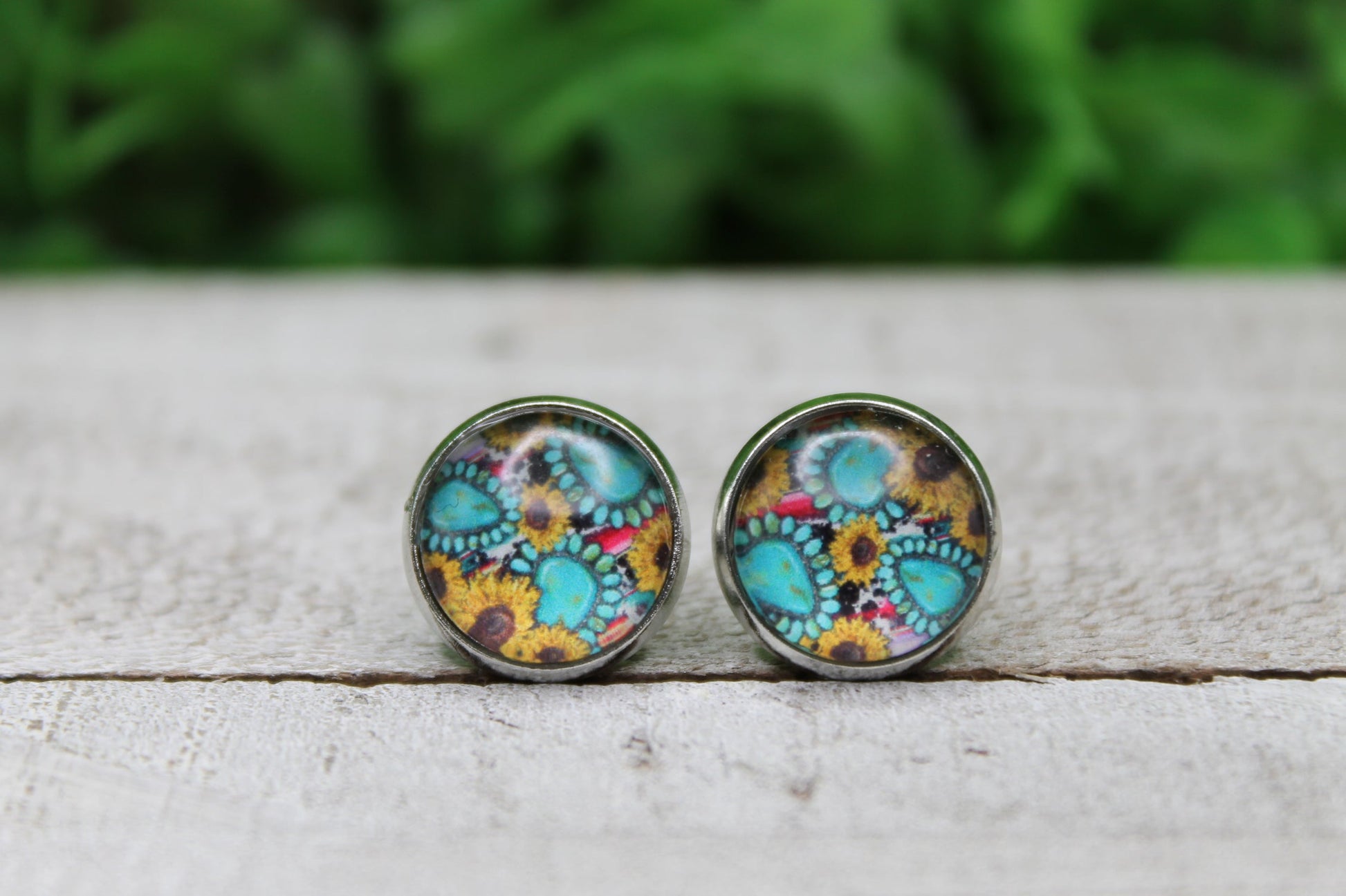 Turquoise and Sunflowers 12mm Glass Stud Earrings || Hypoallergenic