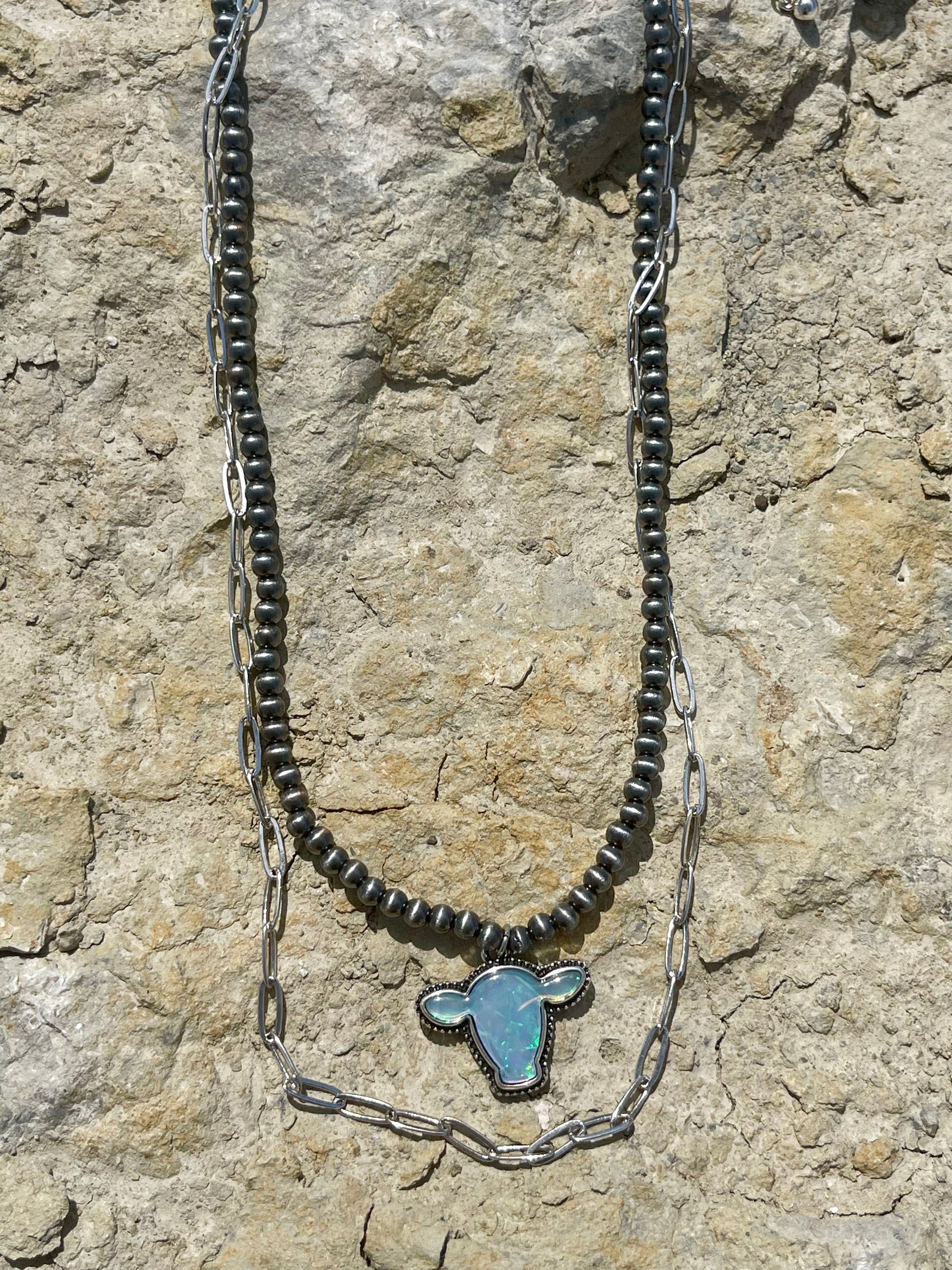 "Moo-ve over boring jewelry, this turquoise cow necklace is udderly unique. With faux Navajo pearls and a paper clip chain, it's perfect for adding some fun to any outfit. So go ahead and be a lil' bit cow-a-bunga with this playful piece!"