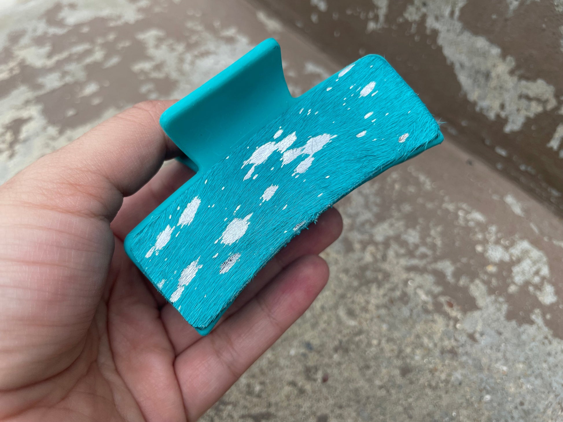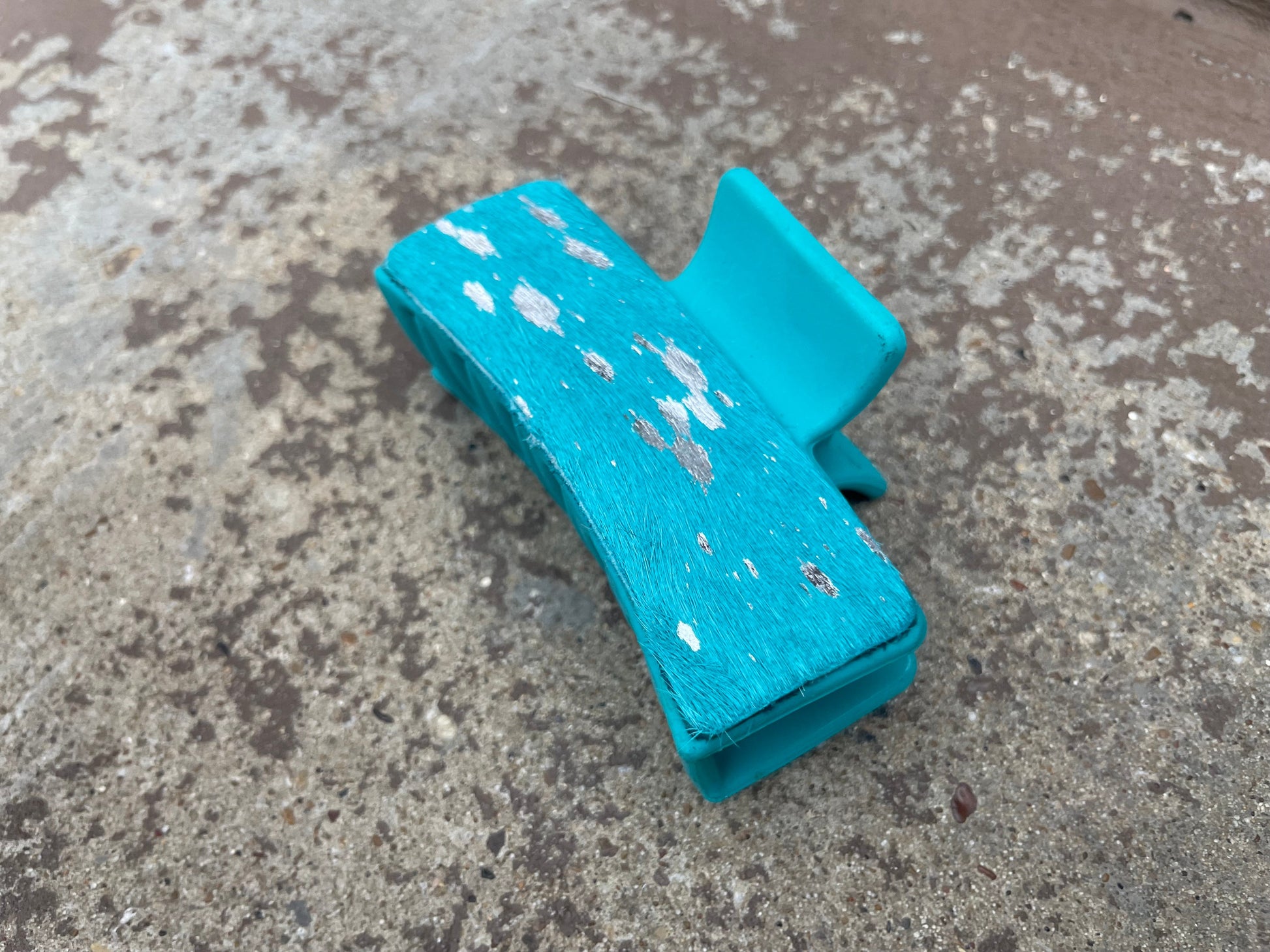 Turquoise Cowhide Silver Acid Wash Tooled Leather Hair Claw Clips 3”