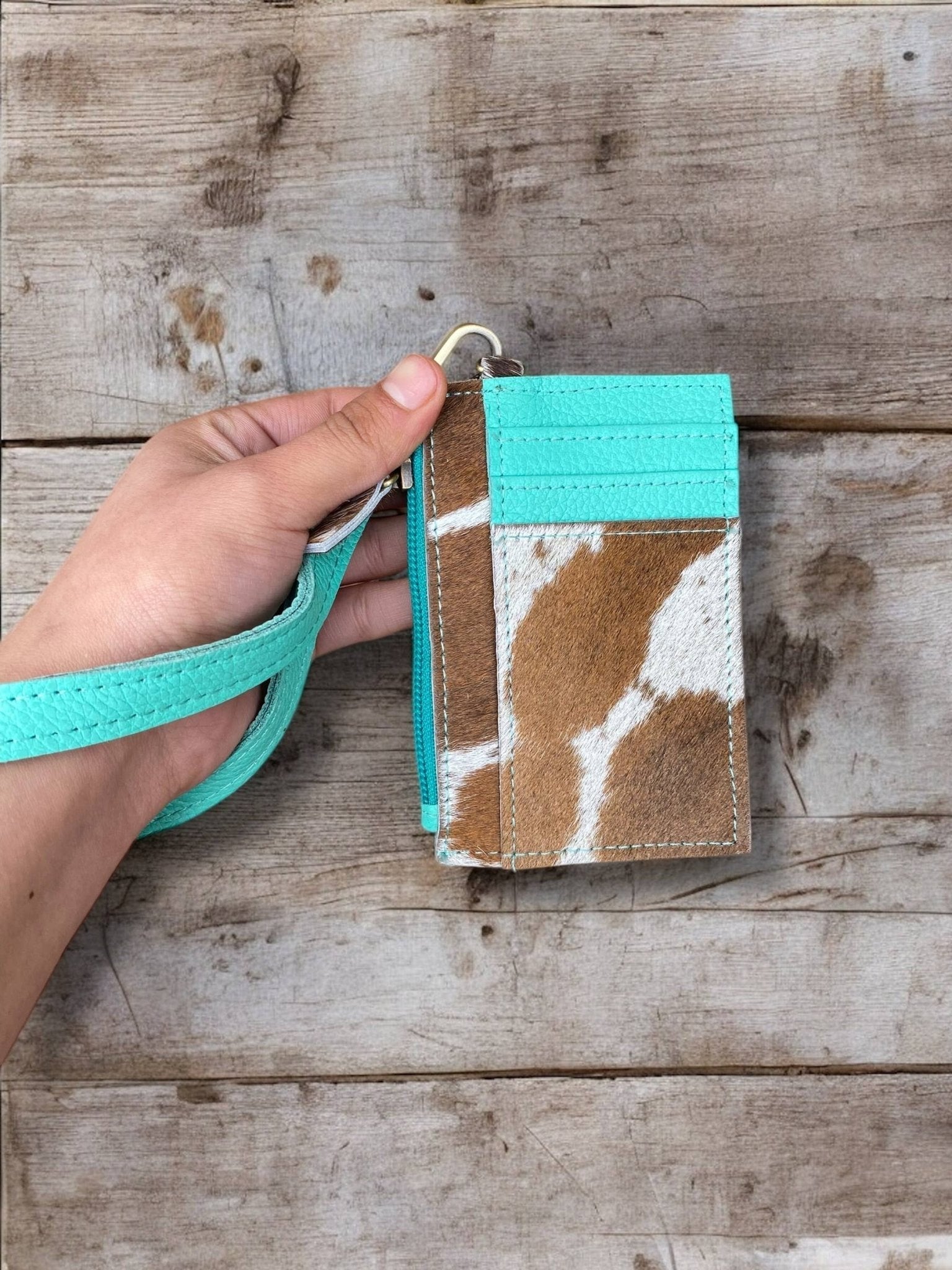 The Turquoise & Cowhide Wristlet is a credit card holder and wallet in one! It is a must-have for anyone who values quality and style. Made with natural cowhide, this wallet exudes elegance and sophistication. Stay organized and stylish with this essential accessory!