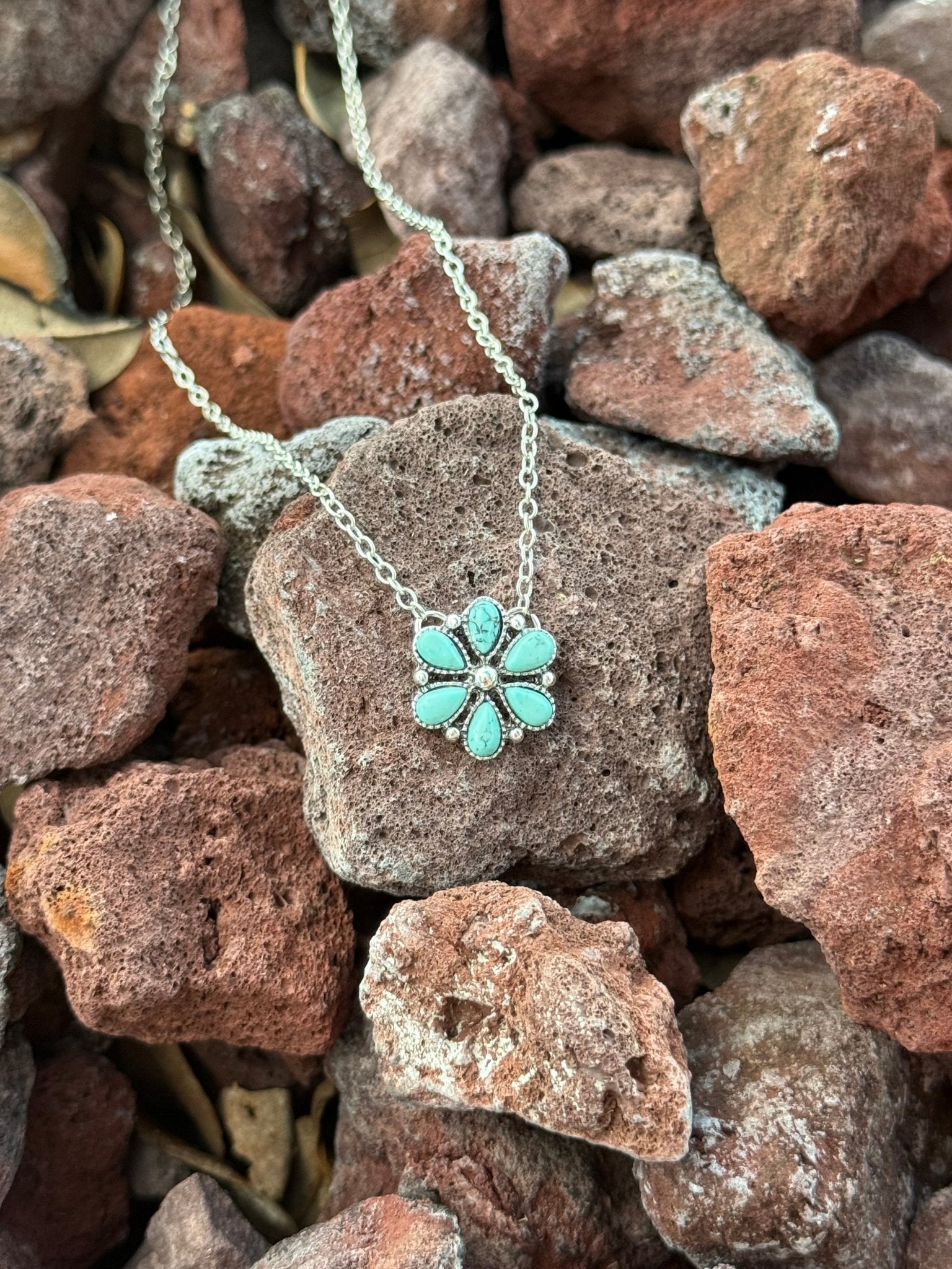 Infuse your look with elegant charm and botanical beauty with this Turquoise Flower Chain Necklace. A finely crafted flower pendant, composed of turquoise petals, hangs delicately from a lustrous sleek chain bringing a burst of desert color and wild western flair to any outfit.