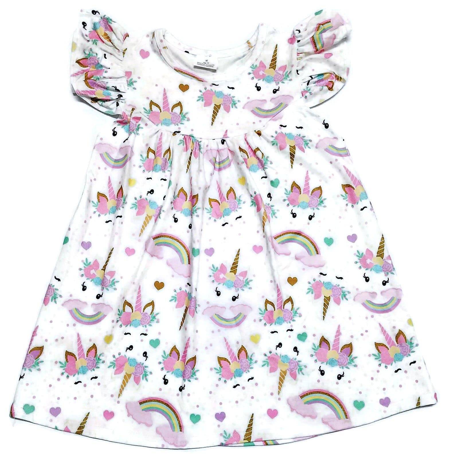 This beautiful dress has unicorns all over it! A staple for your child's wardrobe! Light and airy, made of milk silk. 95% cotton 5% spandex. Wrinkle free!! Your little one can wear this dress alone on warm days, or easily layer with a long sleeve t-shirt and/or leggings!