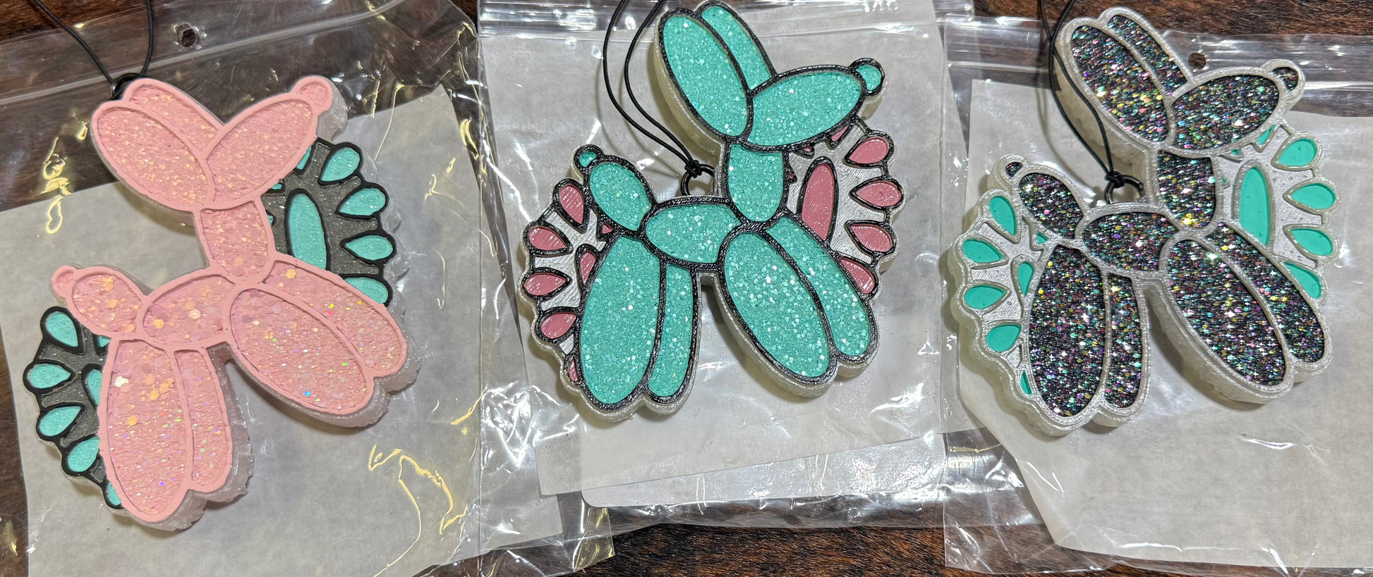Ride in style with our Western Balloon And Concho Dog Car Freshie! This fun air freshener will keep your car smelling great, while also adding a playful touch to your vehicle. No more boring car rides, let this freshie spice things up!