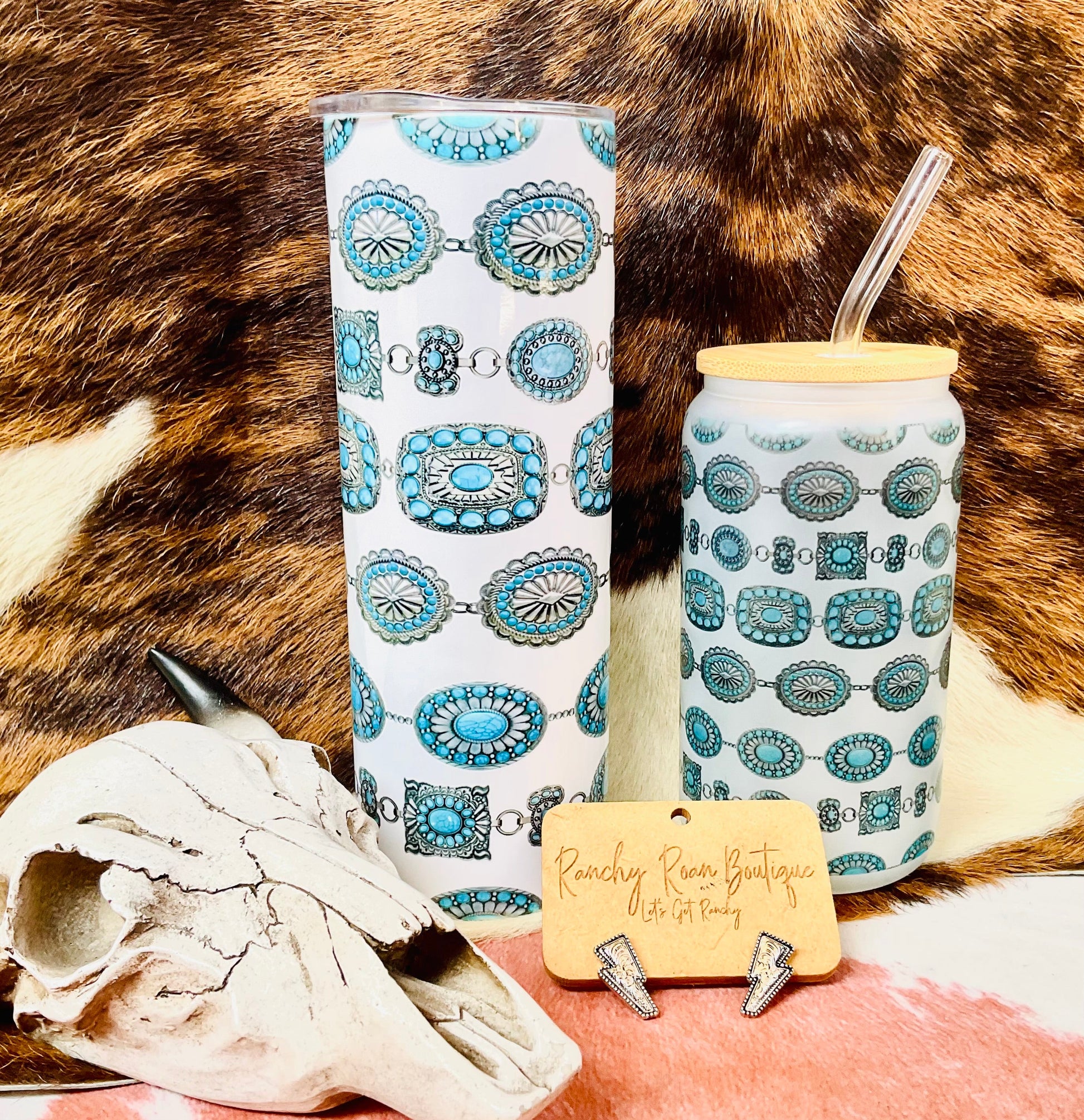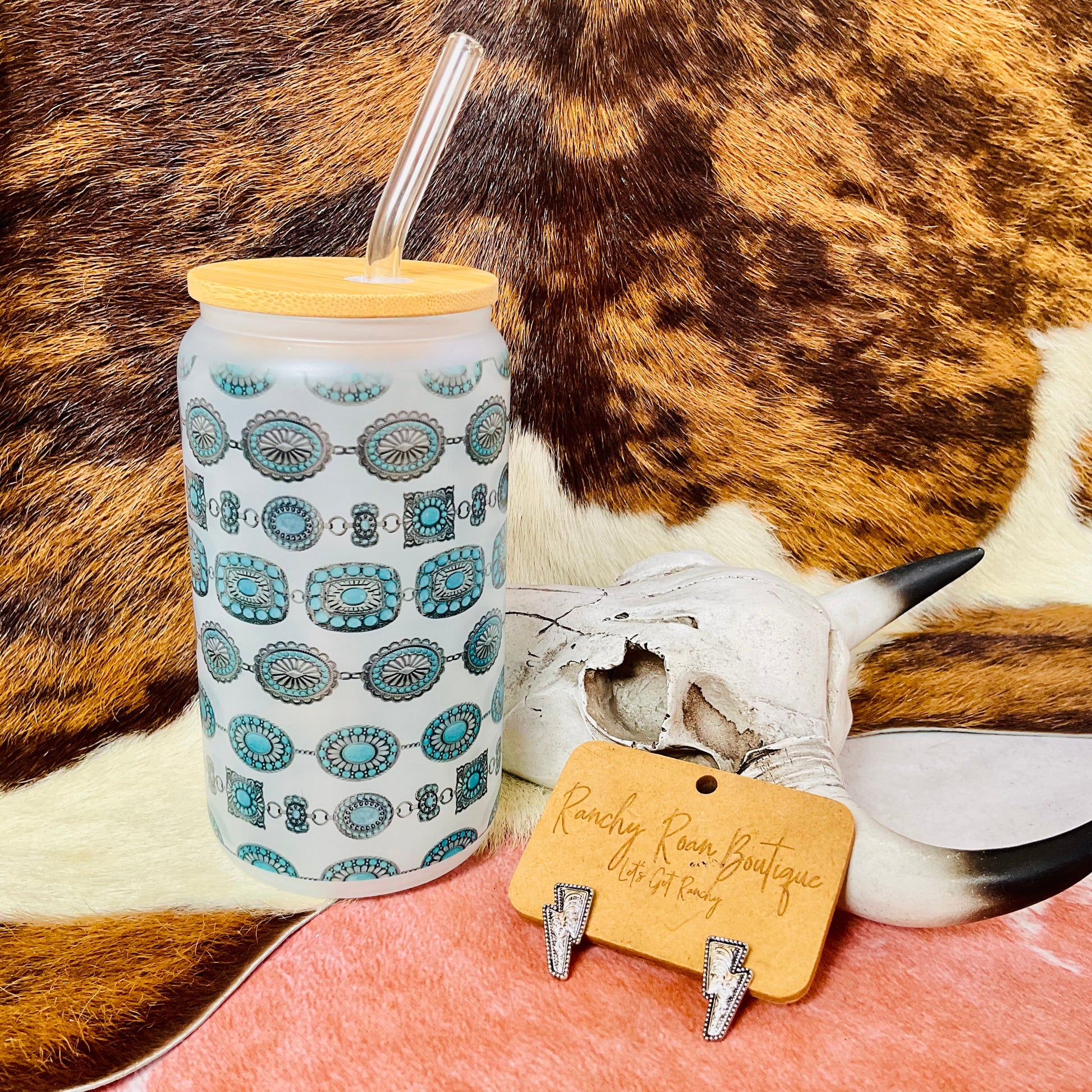 Sip in Western style with this 16oz frosted glass can cup, featuring a striking concho-inspired design. Perfect for iced coffee, cocktails, or your favorite beverage, this cup comes with a bamboo lid and reusable straw for a stylish and sustainable touch. A must-have for Western boutiques looking to stock unique, high-quality drinkware.