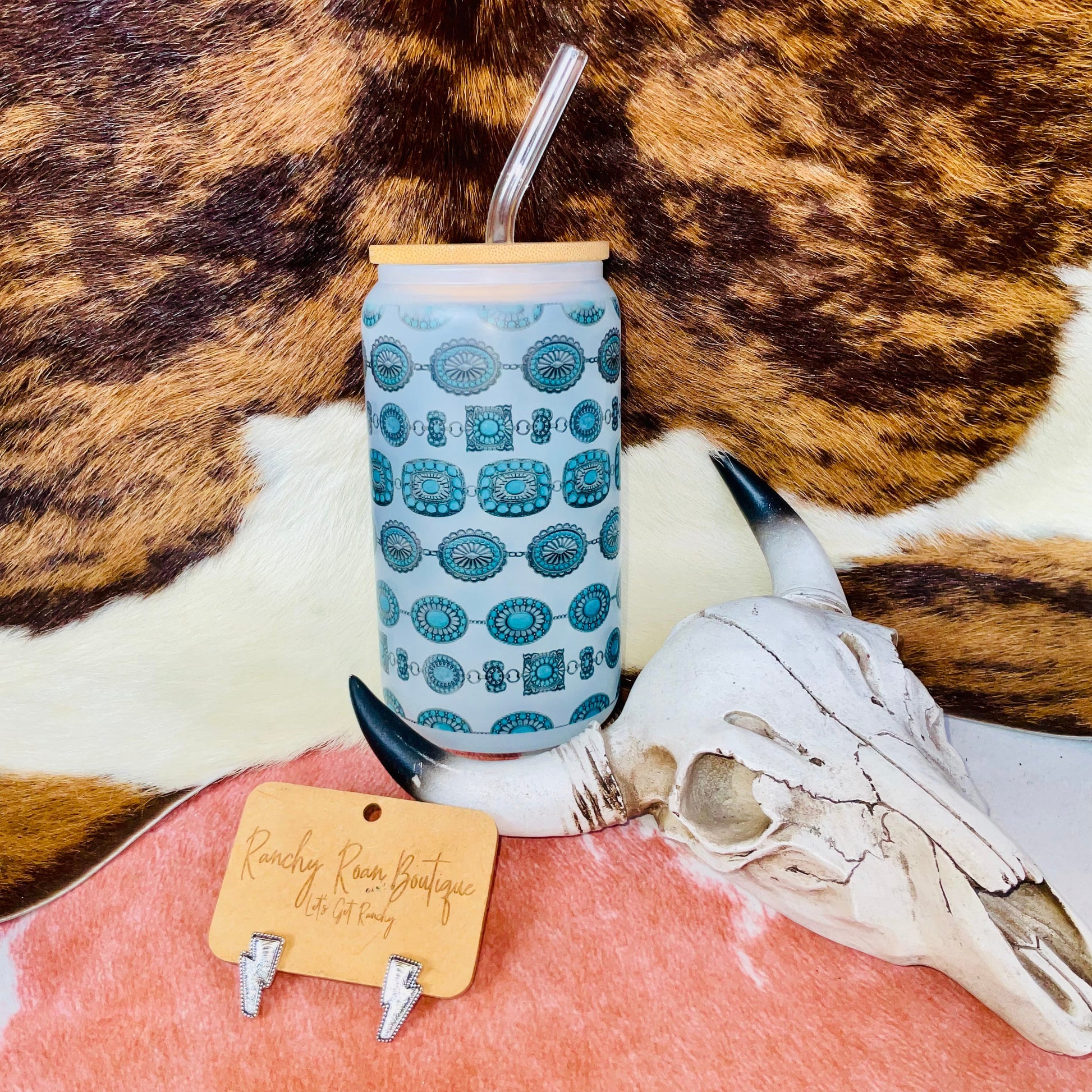 Western Concho Glass Can Cup 16oz Frosted Boho Drinkware