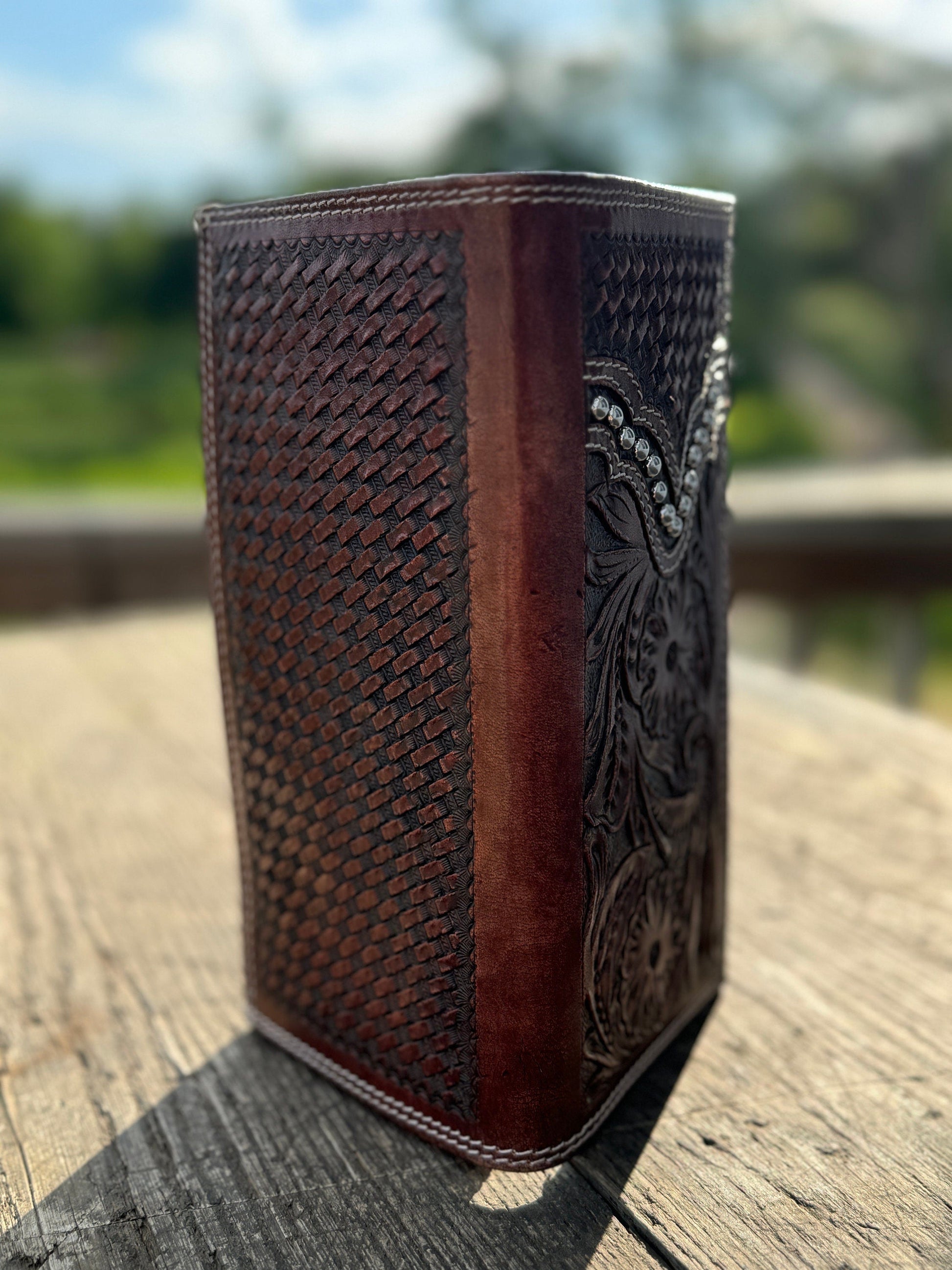 Features: Genuine Leather, Fully Tooled with basketweave and floral designs. Snap closure, 15 card slots, id slot, 4 cash/receipt slots.