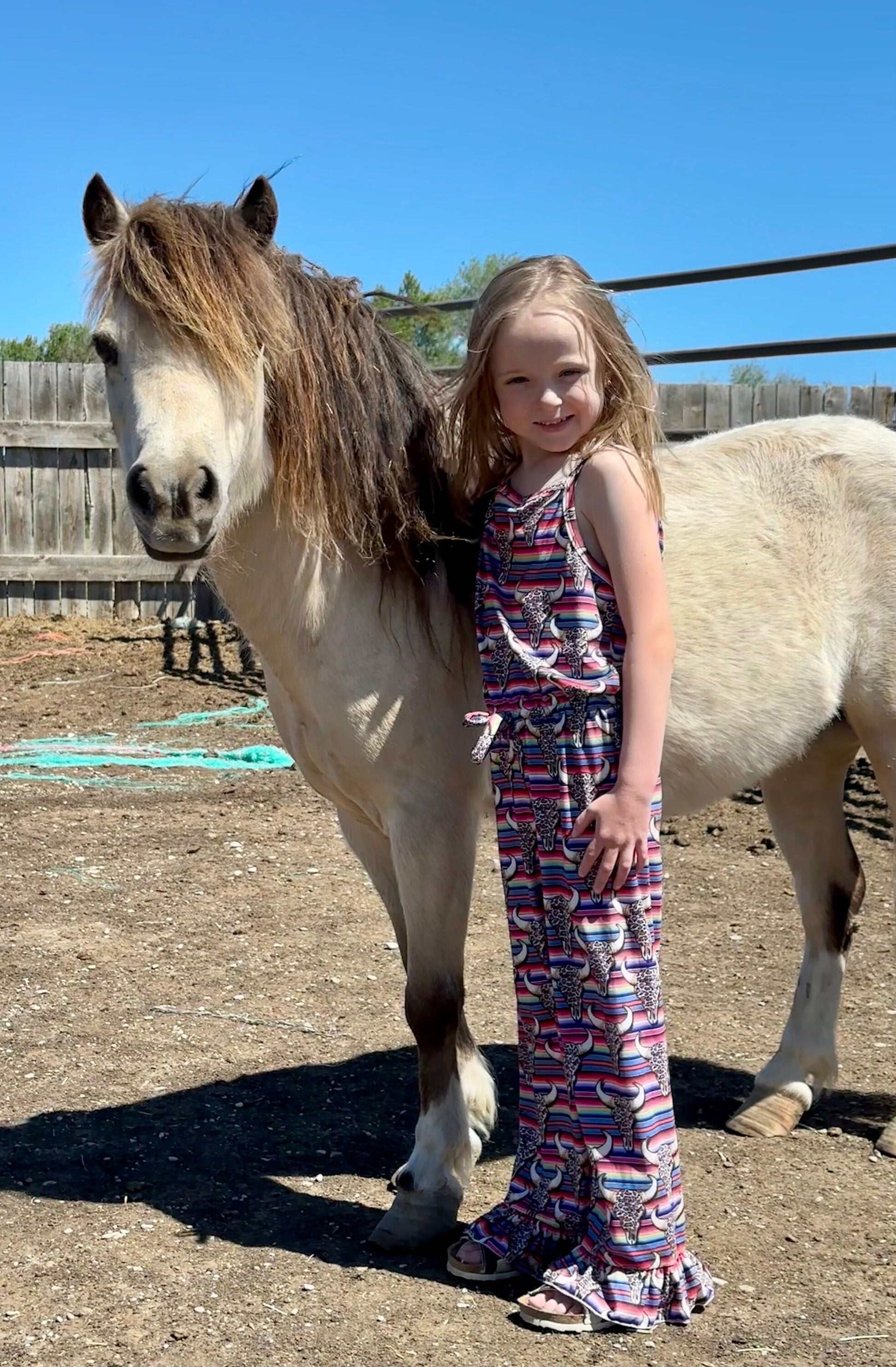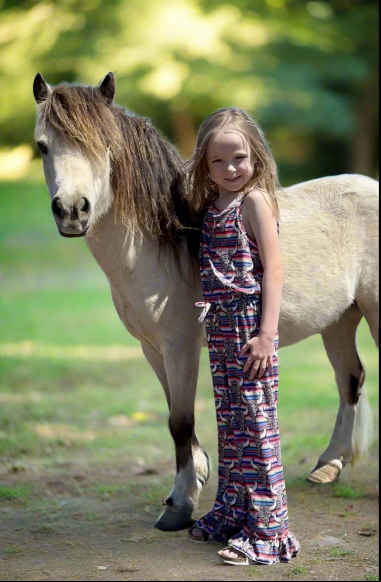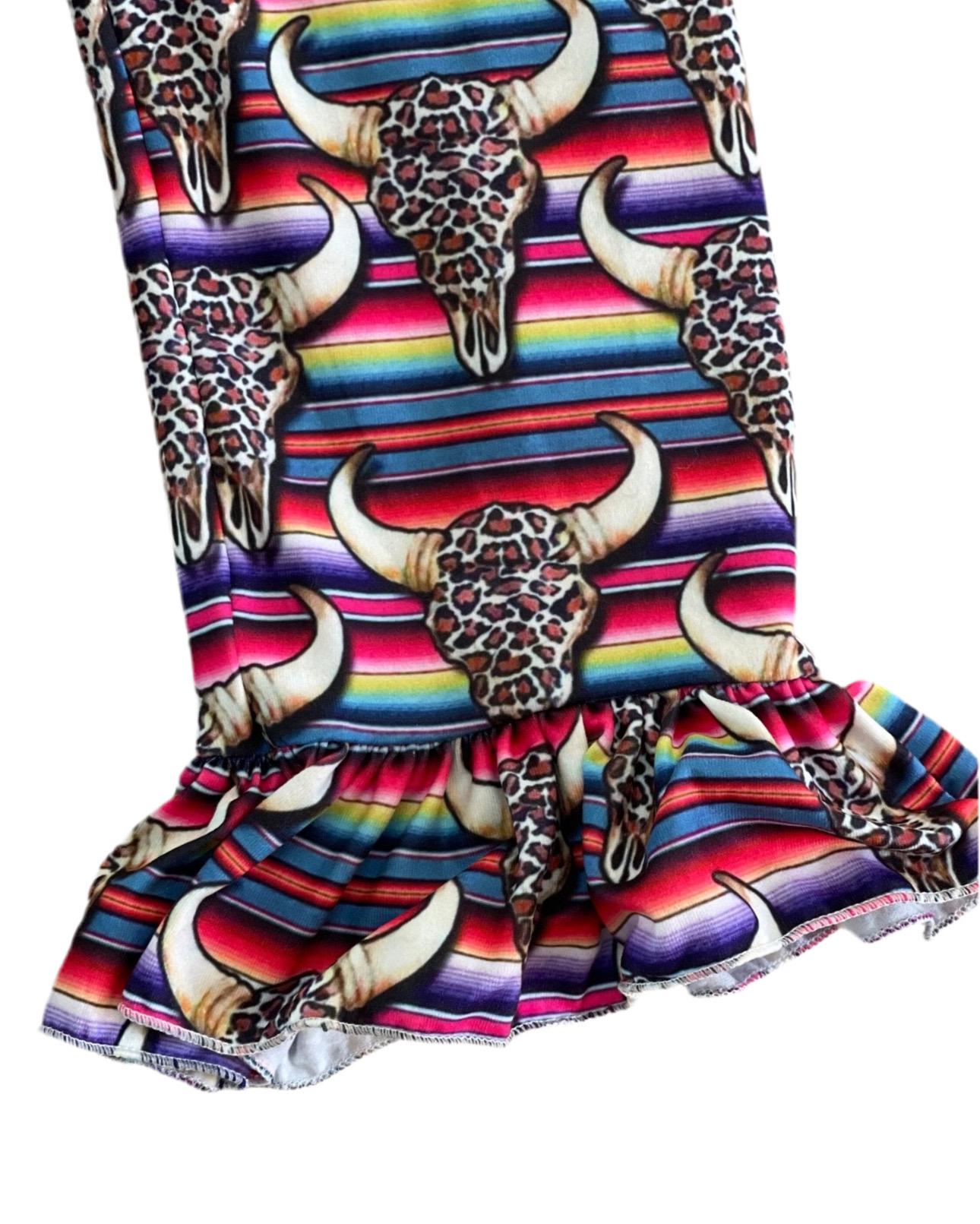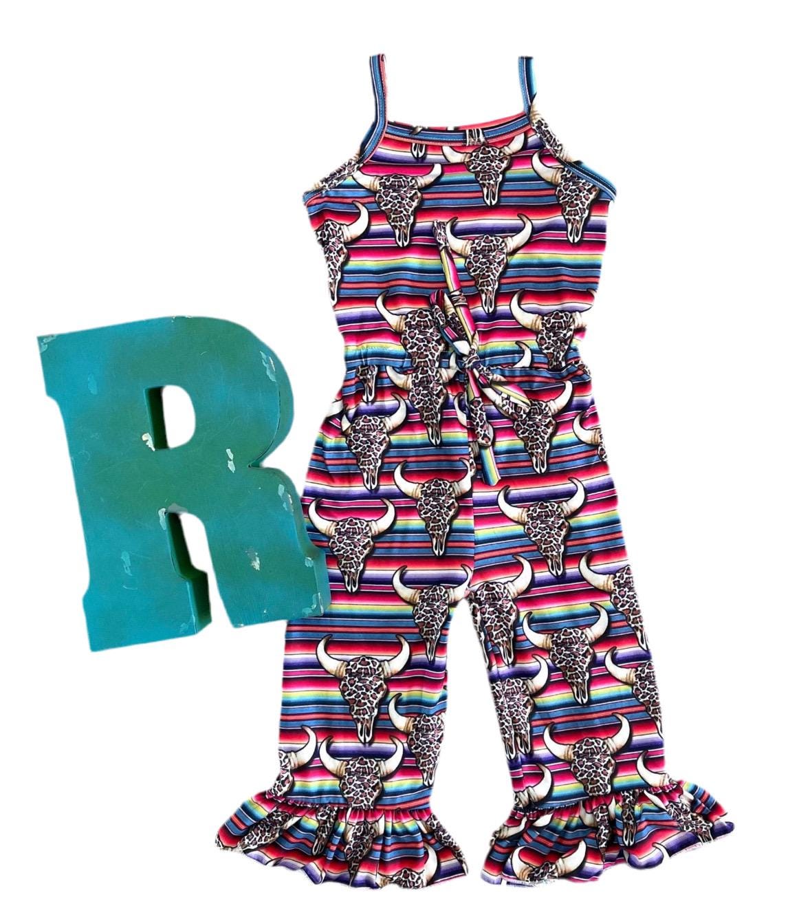 How fun and Western fabulous is this Bell Bottom Romper? Featuring bold serape stripes, cow skulls, and cheetah print, it combines all the best Western elements into one stunning piece! A great choice for spring and summer, it's perfect for rodeos, photoshoots, and everyday adventures.