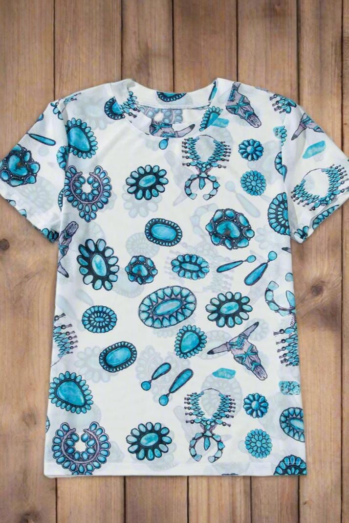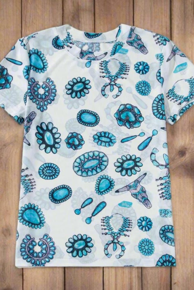 Western Mesh Top - Talk about Western flair with this fun Western Mesh Top featuring cow skulls, squash blossoms, and turquoise conchos!