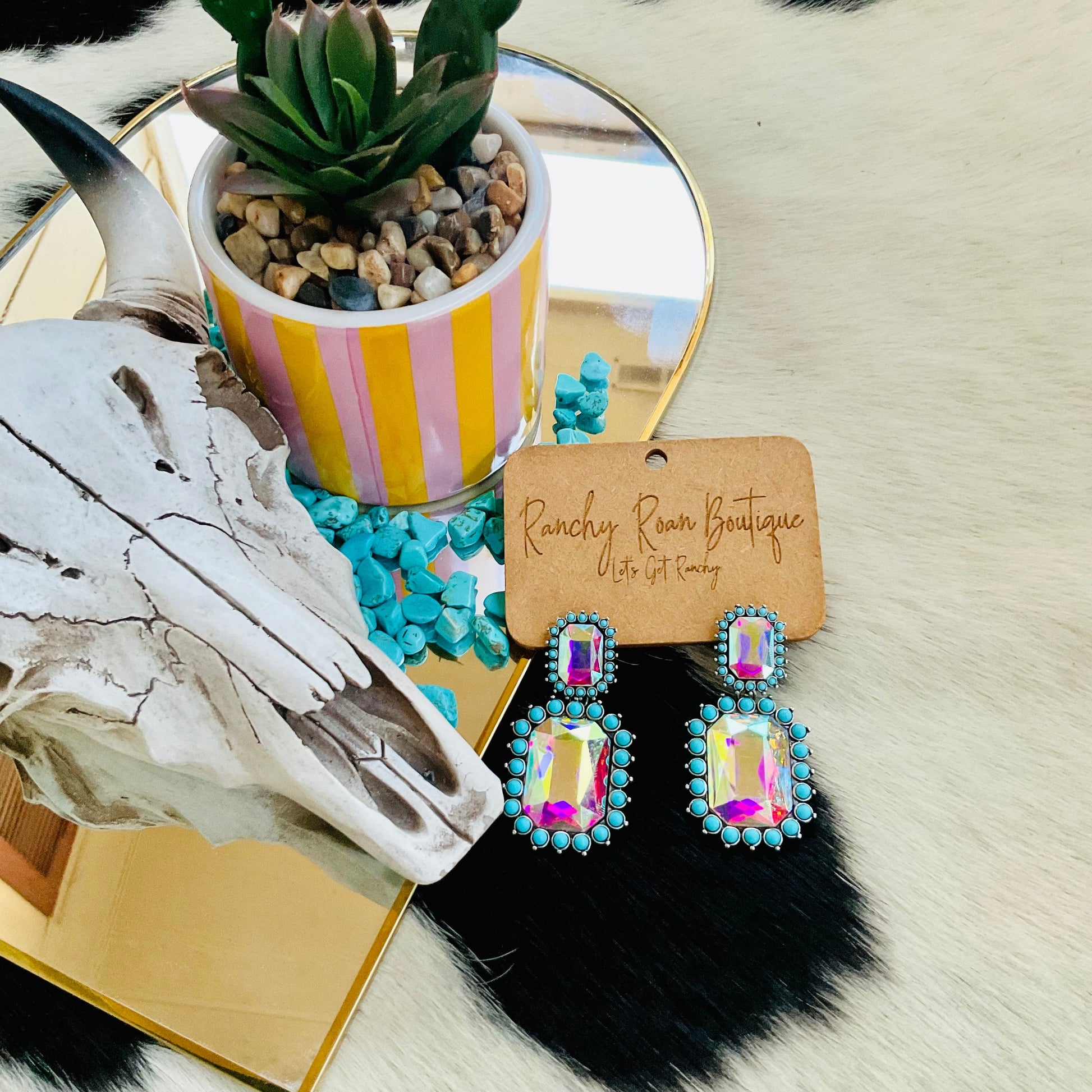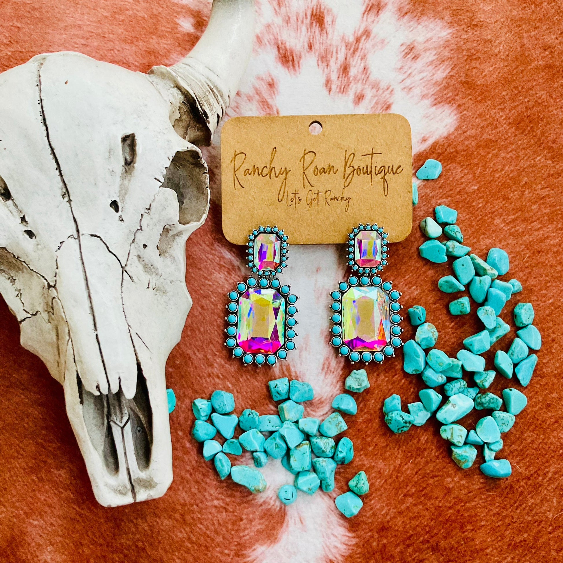 Add a touch of sparkle to any Western-inspired wardrobe with these stunning Western octagon stone stud earrings. Featuring burnished silver and turquoise accents with a bold AB (Aurora Borealis) stone at the center, these earrings are designed to make a statement. Perfect for boutique owners looking to add high-quality, eye-catching jewelry to their collection, these earrings pair well with both casual and dressy Western outfits.