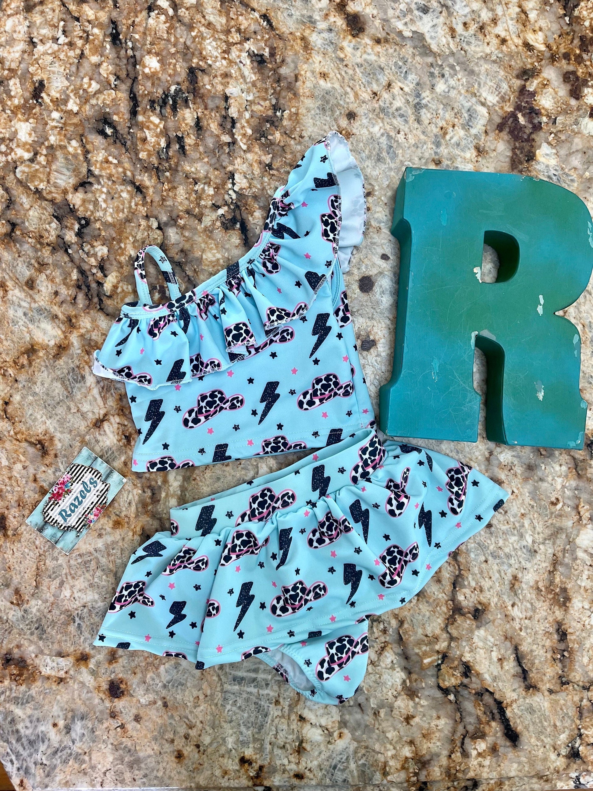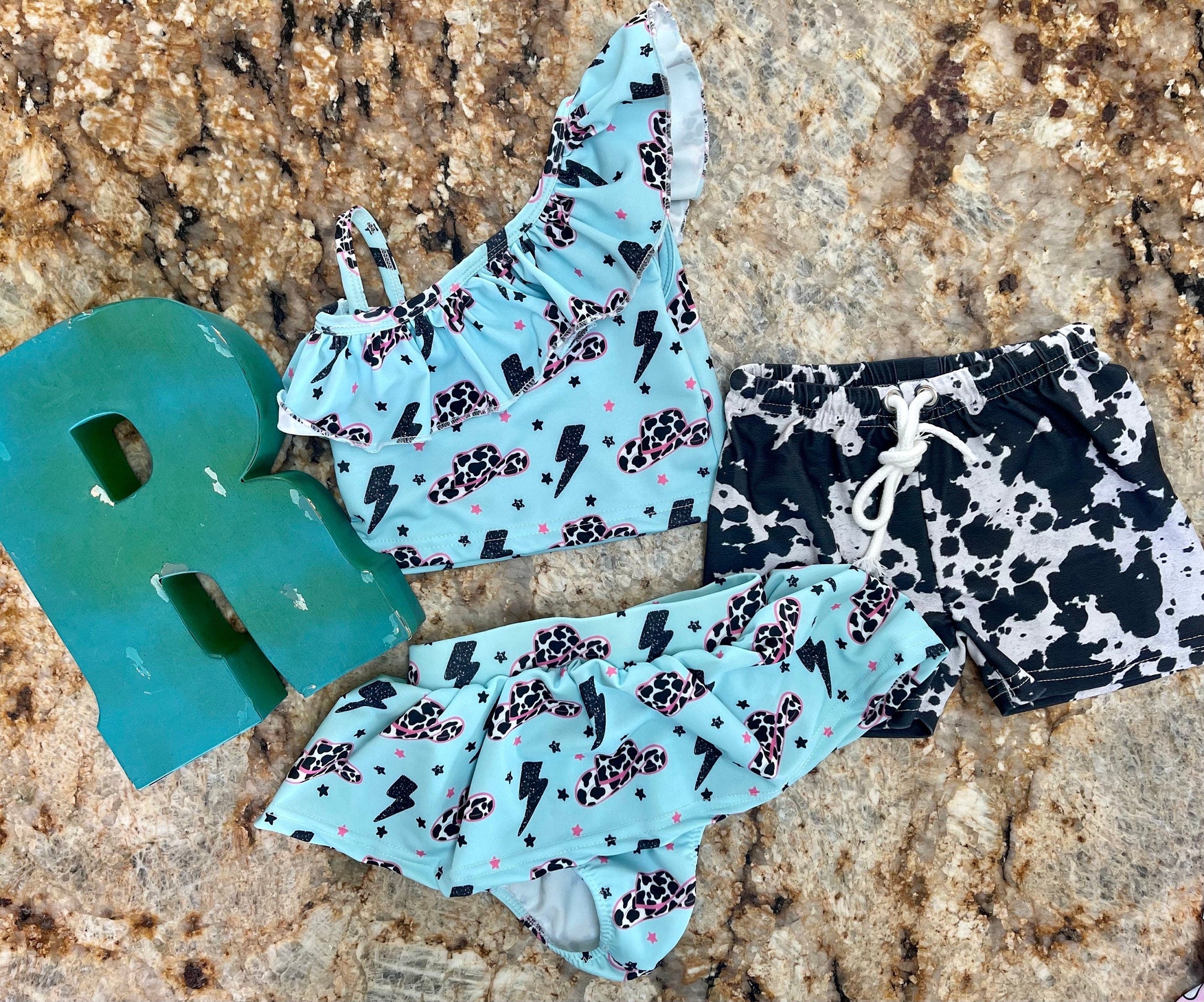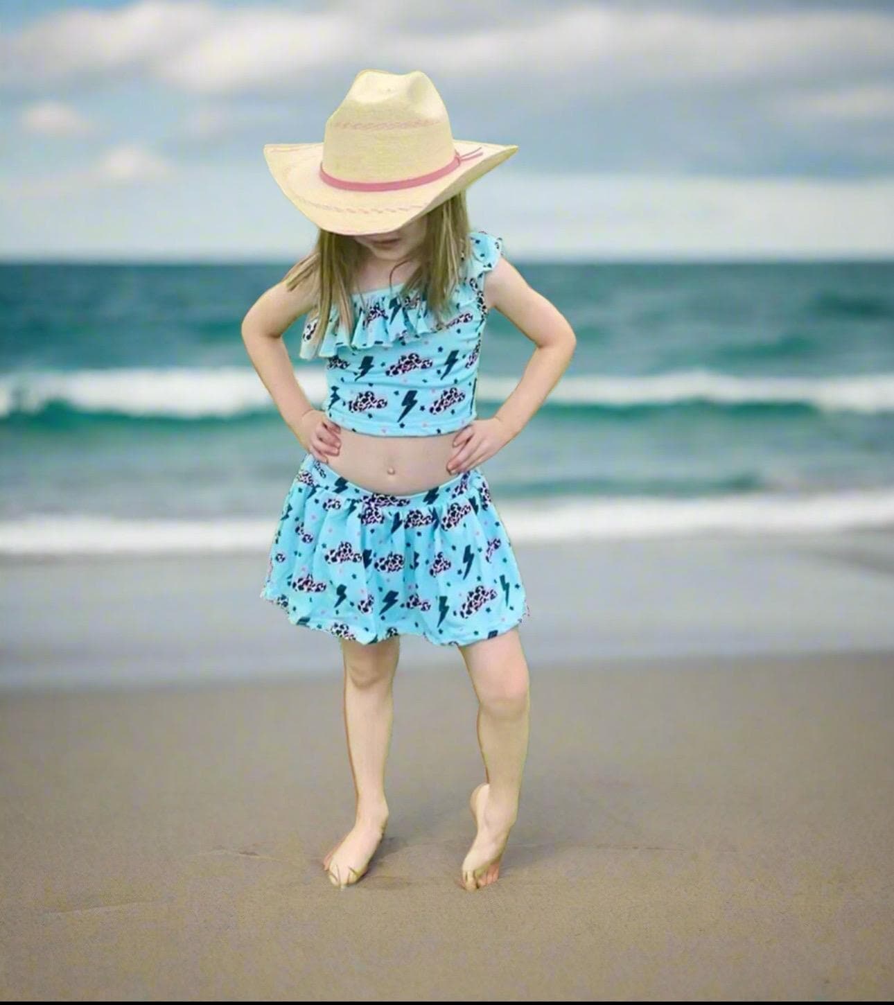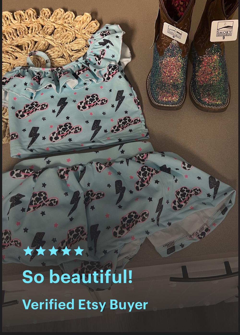 If this isn’t a Cowgirl swimsuit, I don’t know what is! 😍 Featuring black & white cowprint, cowgirl hats, thunderbolts, and a touch of turquoise—all wrapped up in one fabulous tankini swimsuit with a fun and twirly skirt! Perfect for pool days or beach adventures, this swimsuit has everything your little one needs to feel stylish and confident.