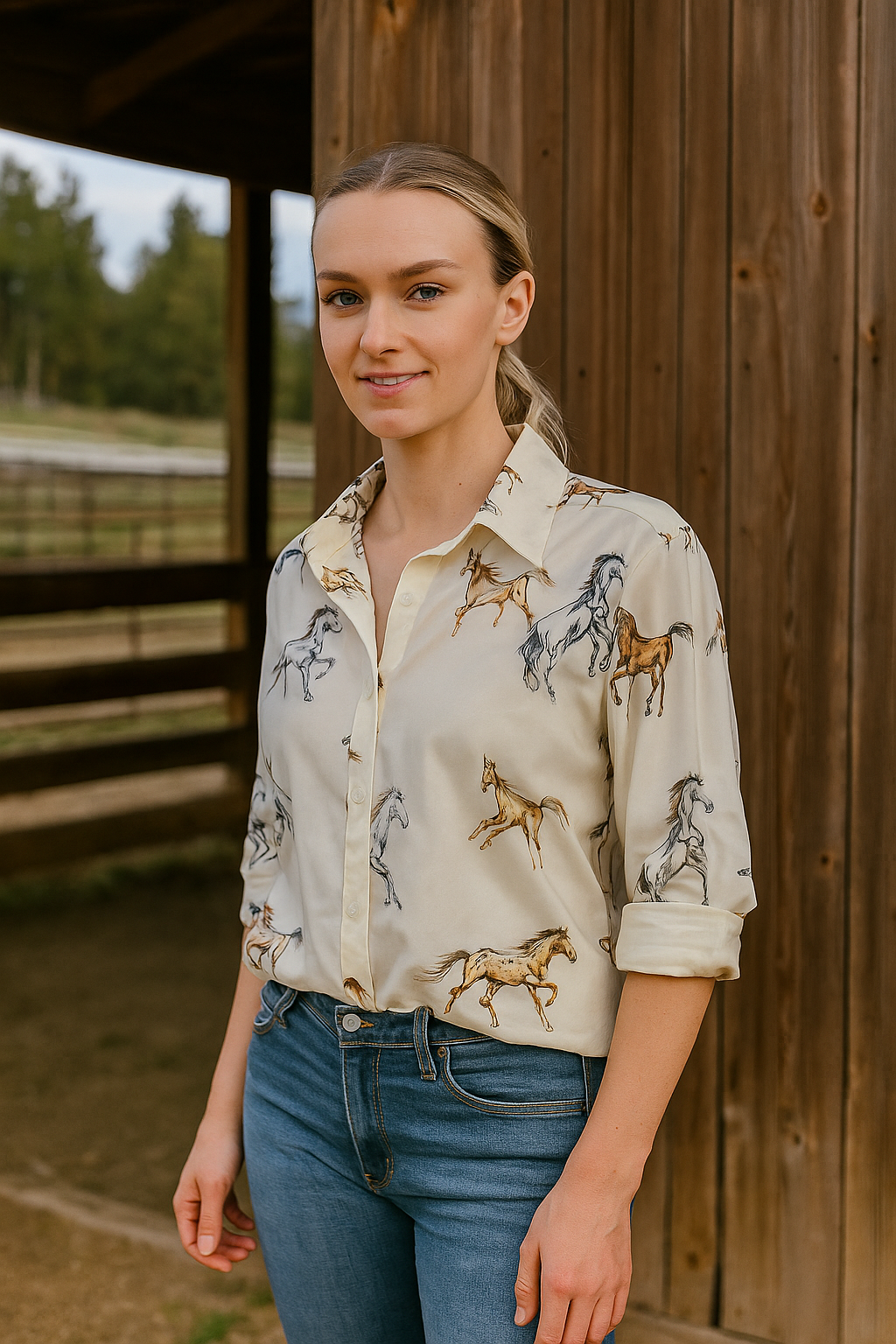 π Unleash your wild side with this stunning Western Horse Button-Up Shirt β a must-have for any cowgirl wardrobe!